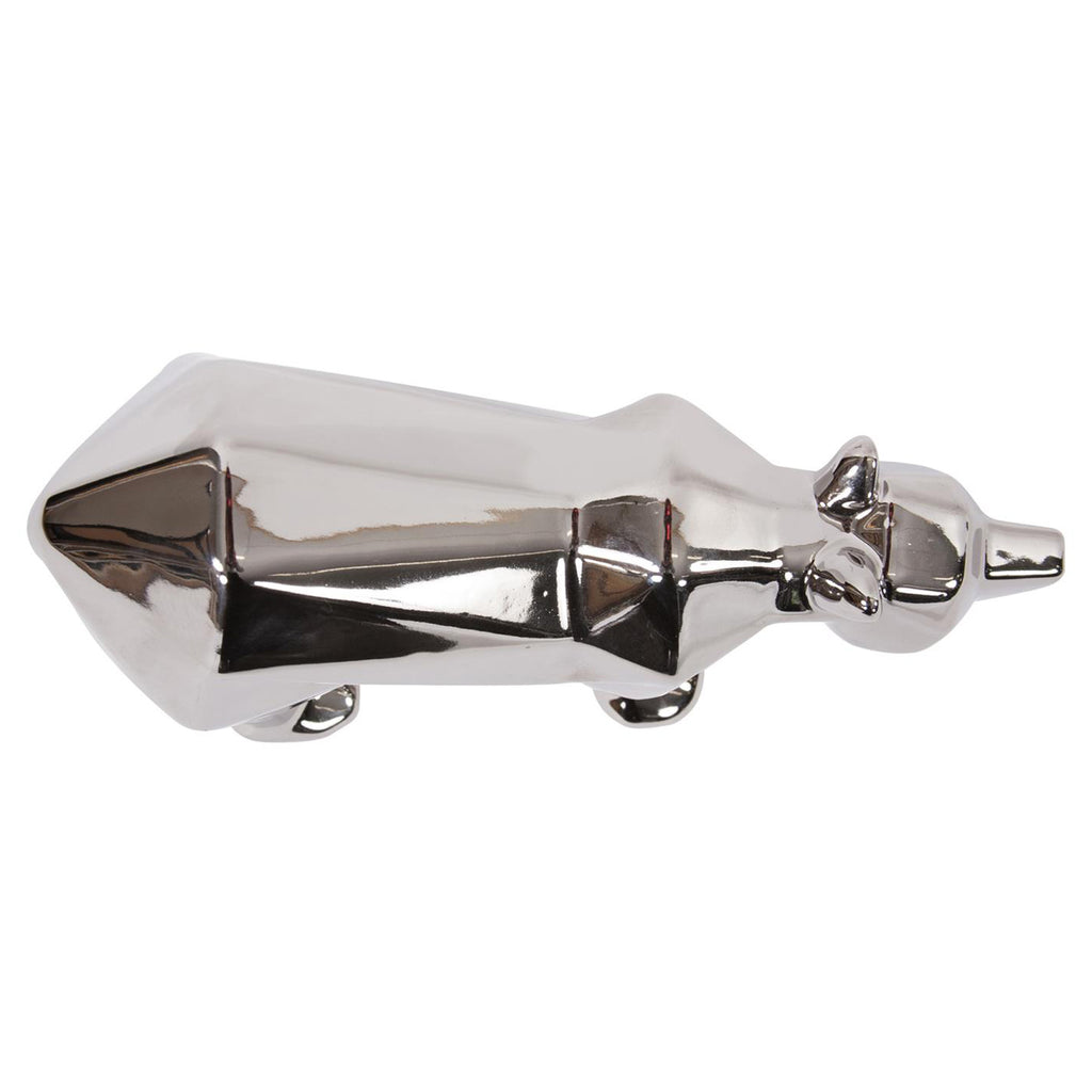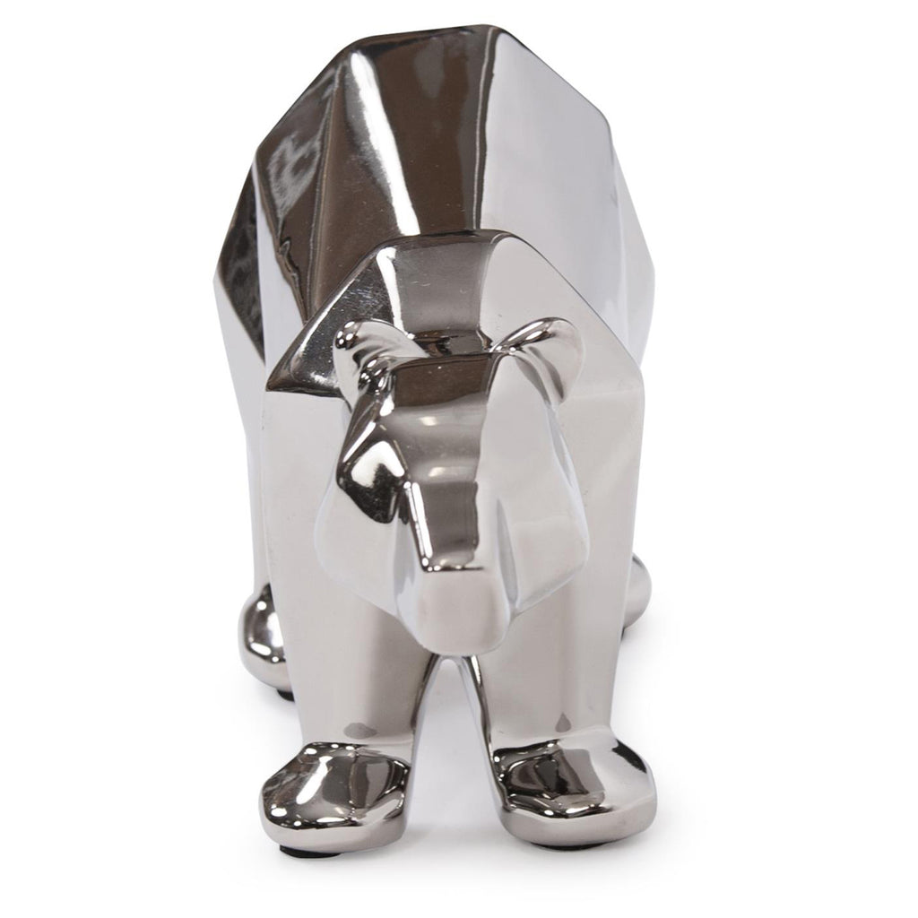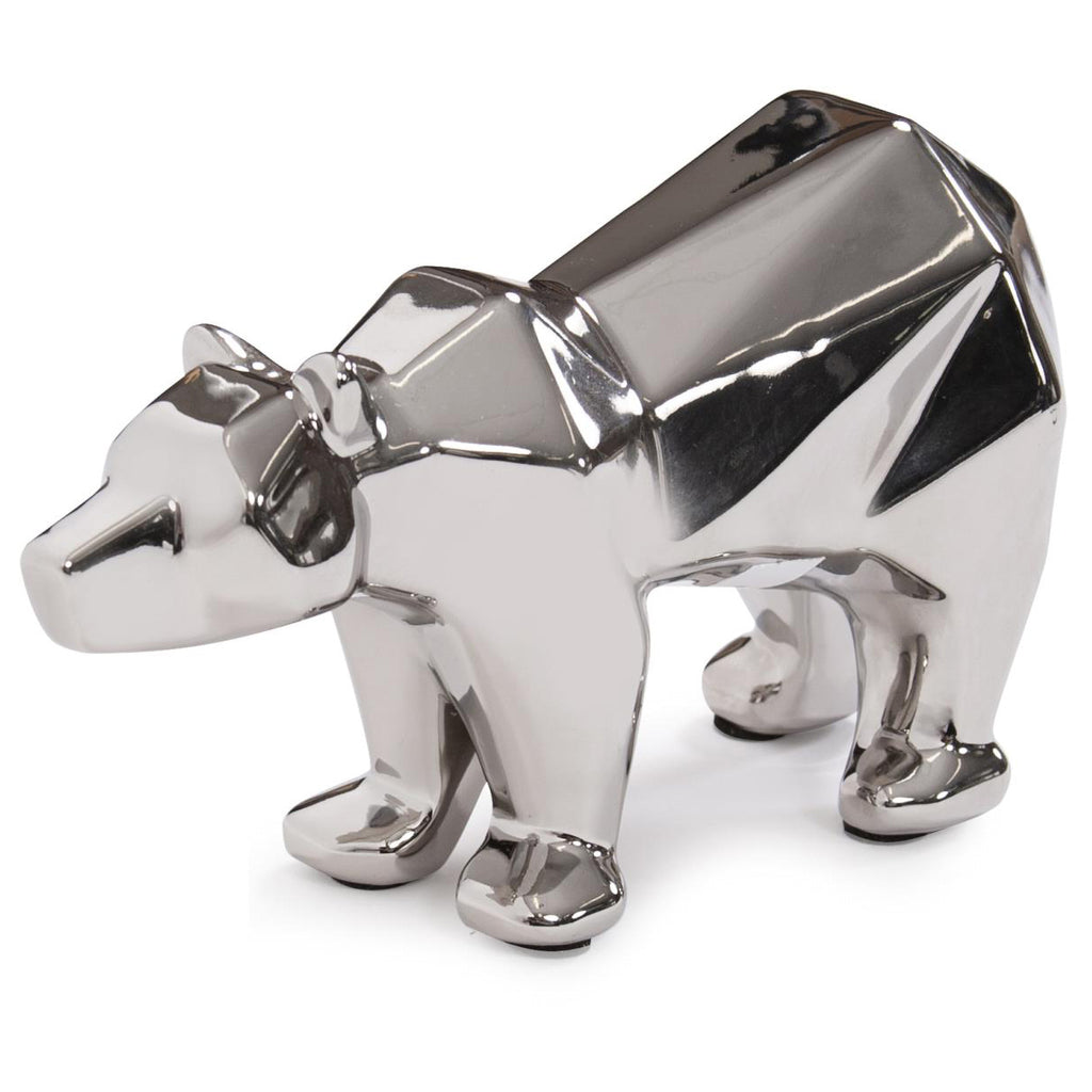 A modern sculptural interpretation of a polar bear is highlighted in an electroplated silver finish. The high polished finish brings in an air of whimsy and yet showcases an artsy twist to the ordinary. Polar bears are now out of the cold and are now a hot accent pieces for a modern decor.