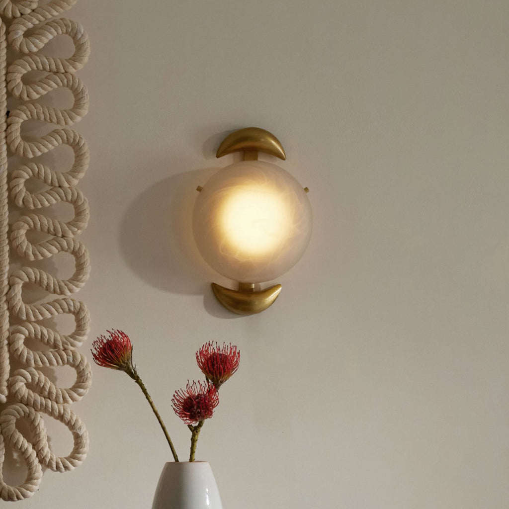 The Arteriors Boîte pendant, chandelier and boîte sconce have a historical familiarity - referencing 19th century milk glass fixtures - and yet the proportions are new: pared down to a modern “machine age” antique brass iron structure and obviously elongated matte swirl glass diffusers. Finish will vary.