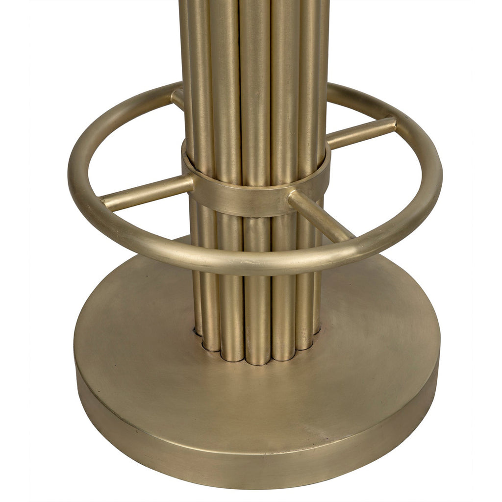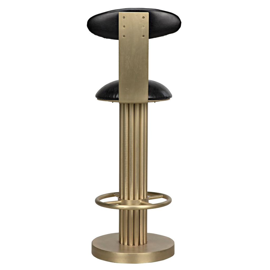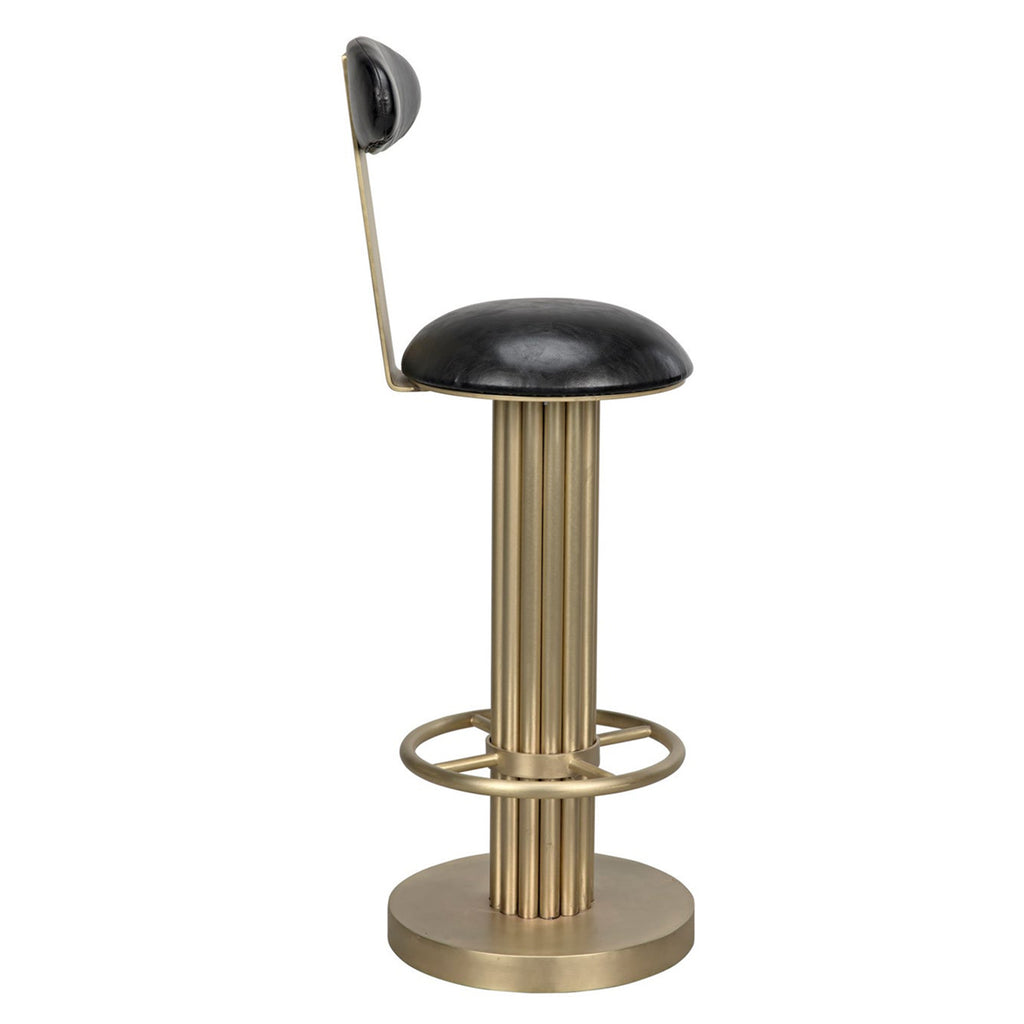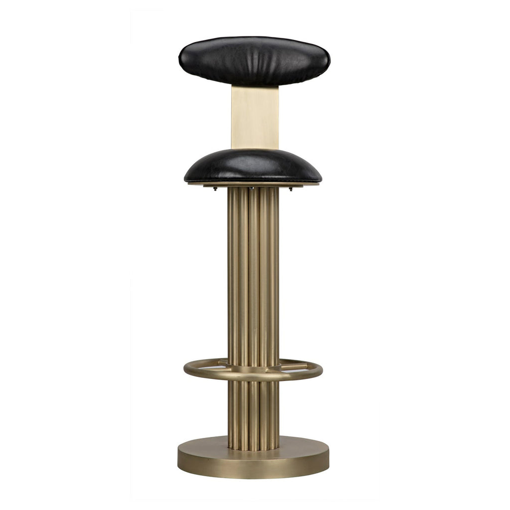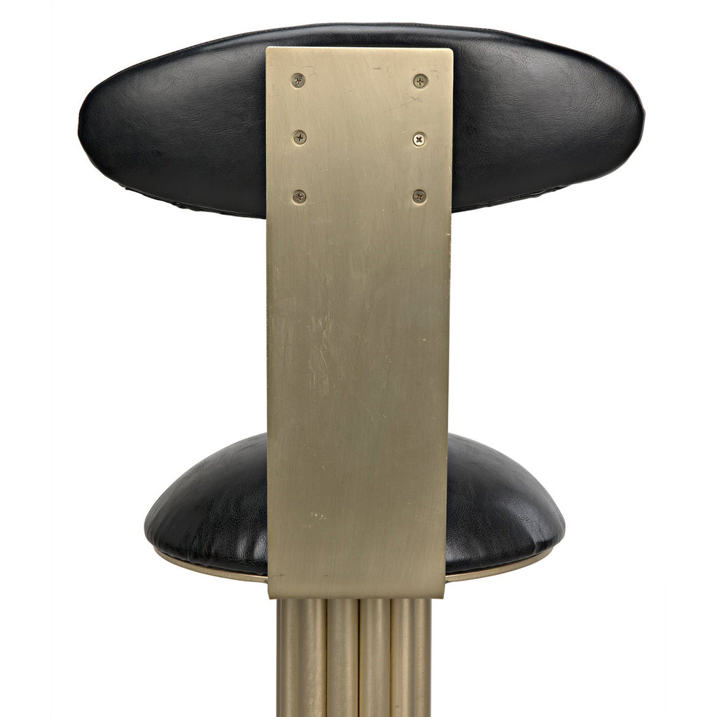 Available in counter or bar heights, the Sedes stools stun. Their art-deco inspiration is obvious, but the quality of the construction and the cleverness of their design deserve additional scrutiny. The bases are industrial strength steel, with an antiqued brass finish. The seat and back are upholstered in rich black leather. And, like everyone's favorite stools. They swivel!