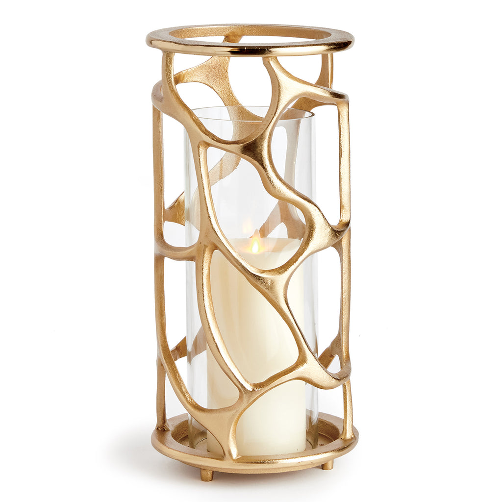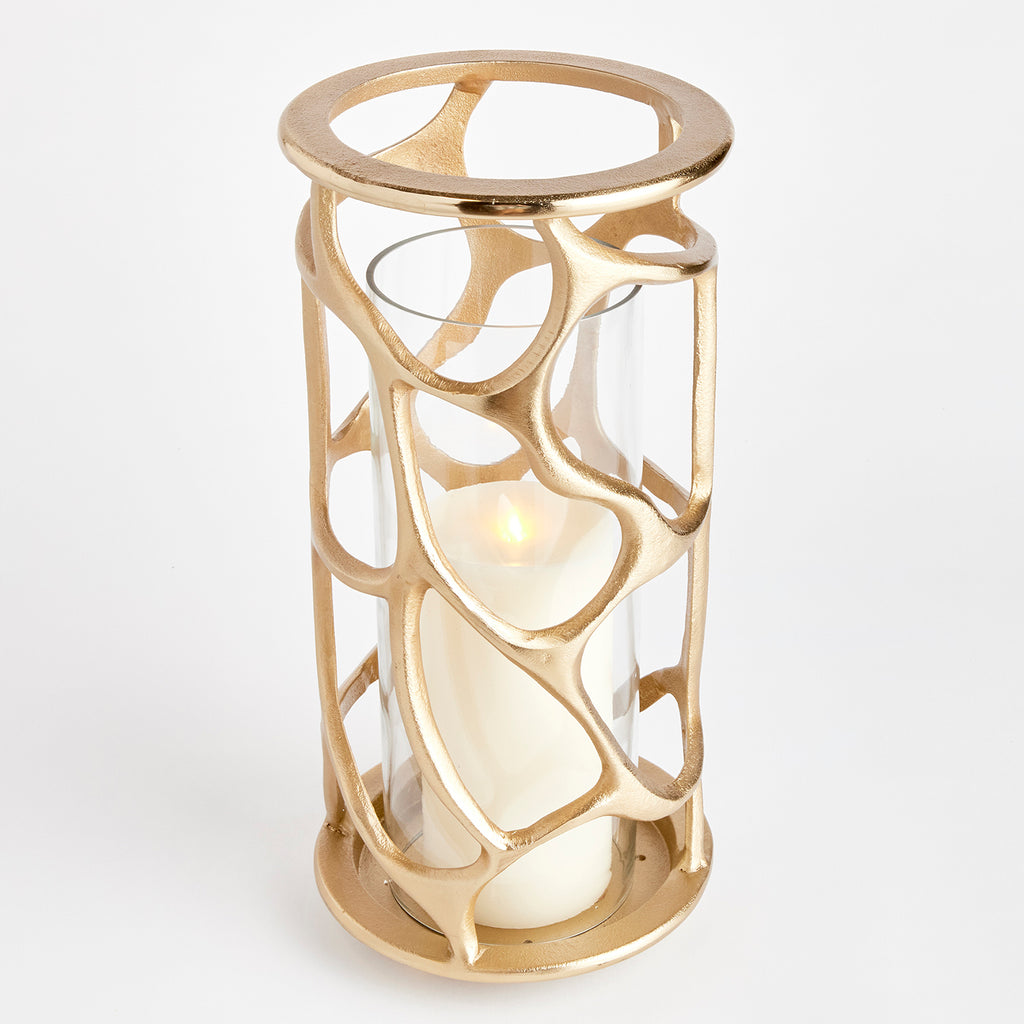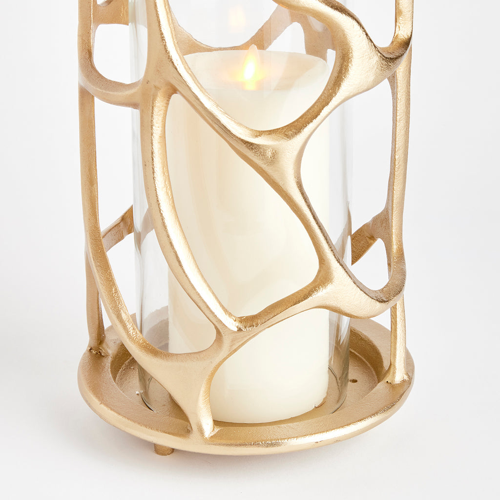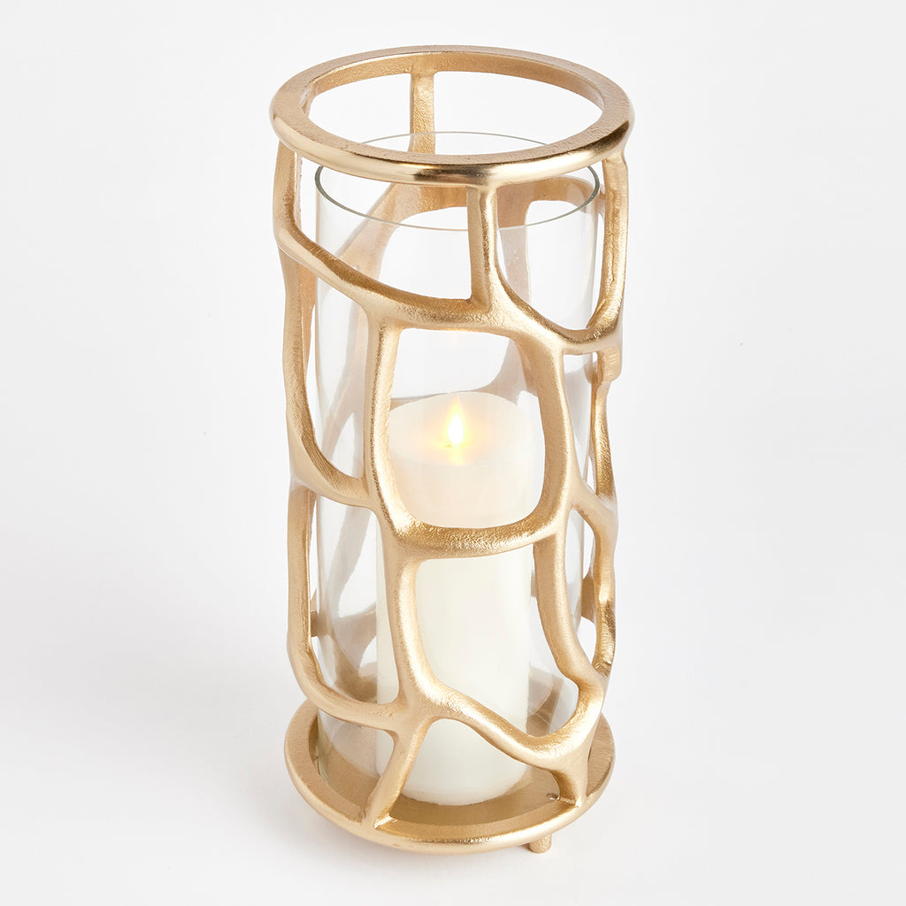 With a hand-sculpted meandering design, you'd never guess this artisan hurricane is made of a sturdy cast aluminum. With a matte gold finish and glass cylinder, it is sure to dress up any modern space.