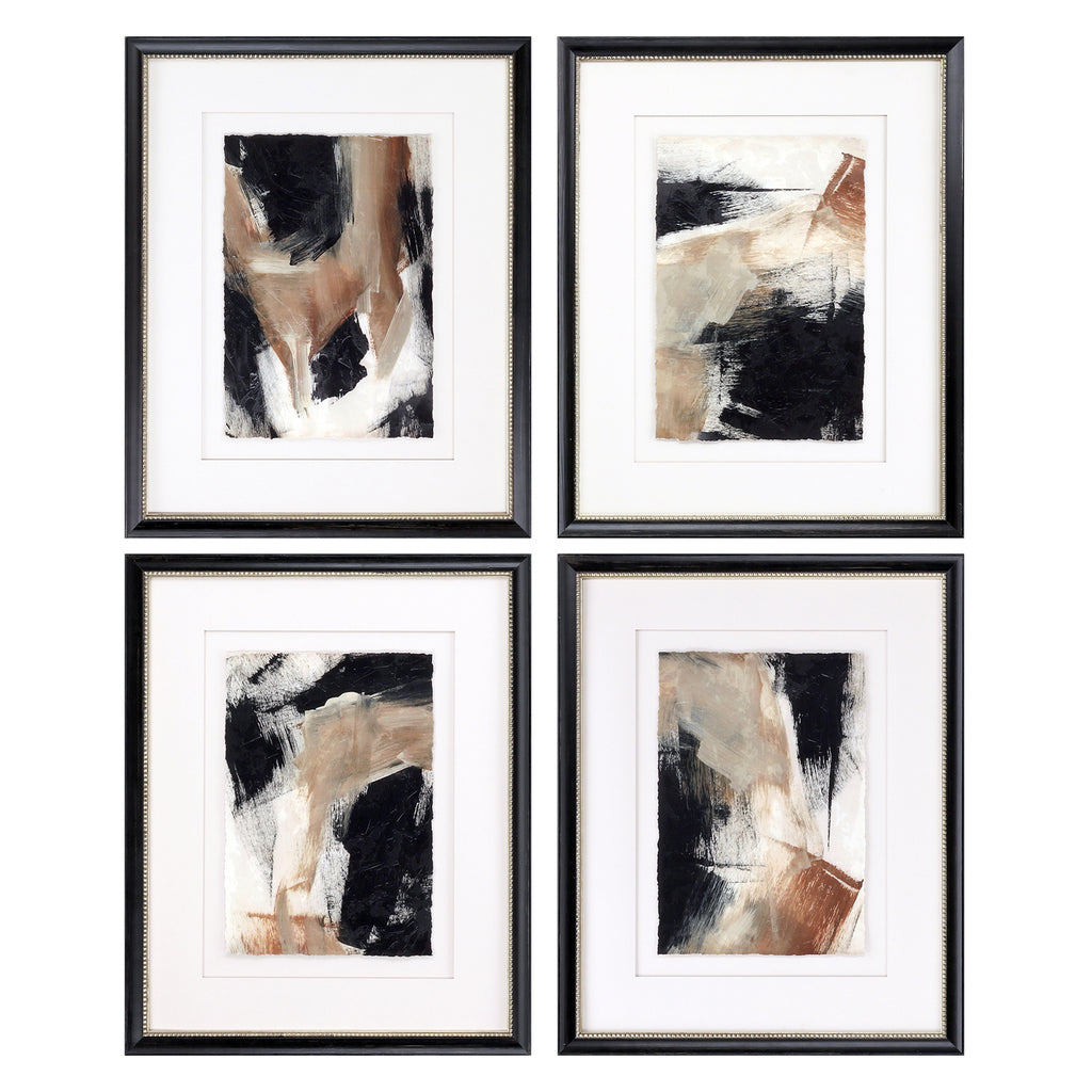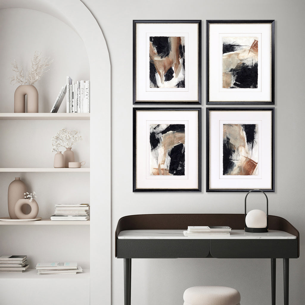 Abstracts are hand deckled and float mounted with raised putty matting. Framed in an aged black painted wood with washed antique gold beaded lip.