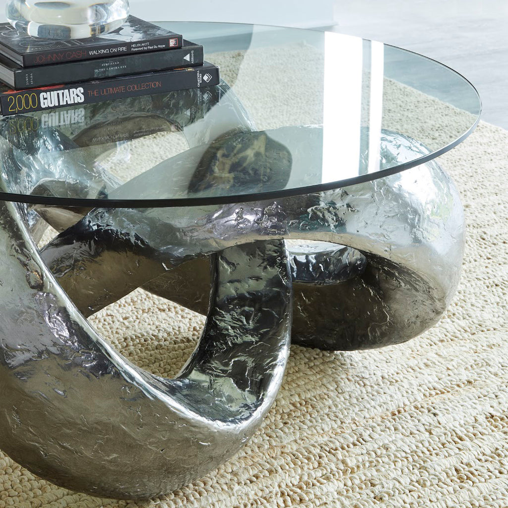 Rather than twist yourself in knots over the perfect coffee table for the contemporary or industrial chic living room, tap the Phillips Collection Trifoil Coffee Table for the job. Made of composite, the knot coffee table has been finished in bronze or silver to look like metal. Given asymmetrical and organically shaped elements add interest to a space, this table, which comes with the glass top, will be a fascinating introduction.