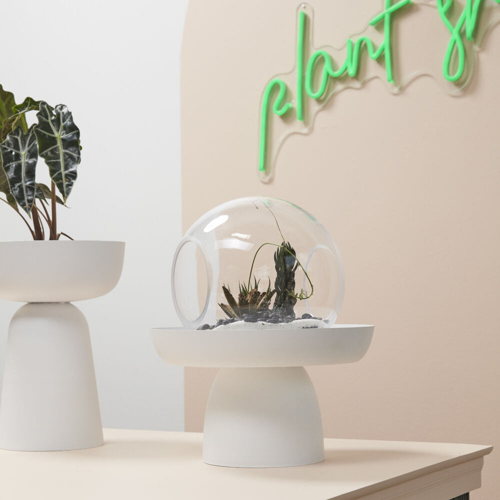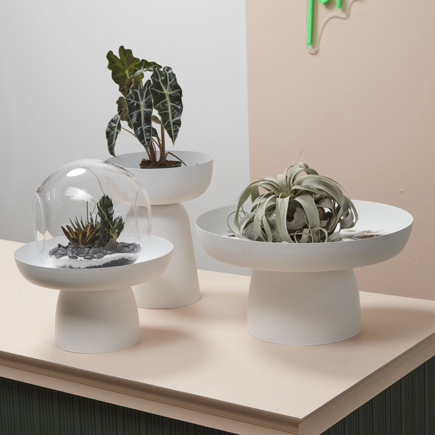 Enhance interior design, elevate retail displays, & enjoy the endless possibilities of the chic & modern Rize Footed Tray. This white powder-coated metal stand takes plants to new levels of sophistication. A bright white finish offers a clean look, perfect for the home or a modern plant shop.