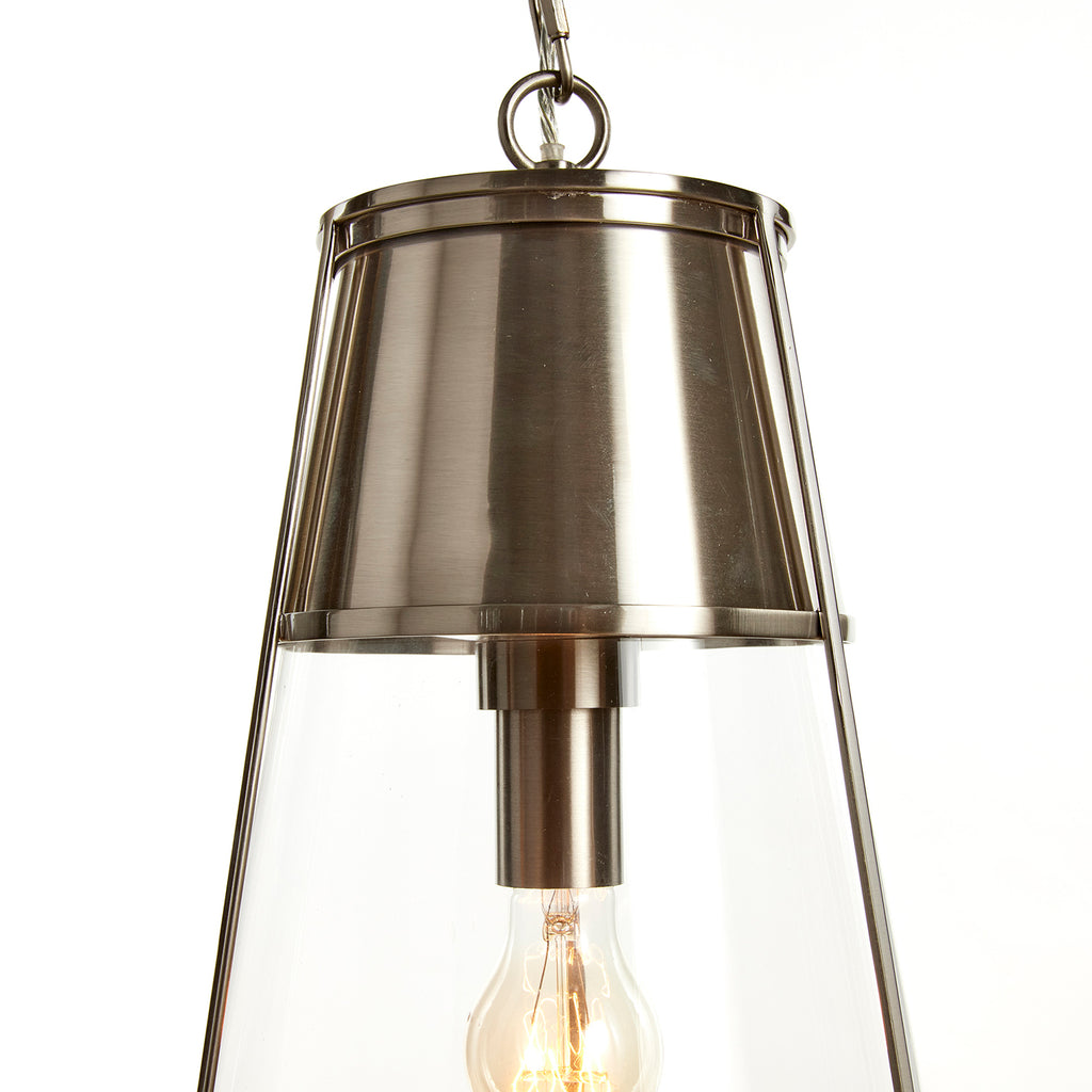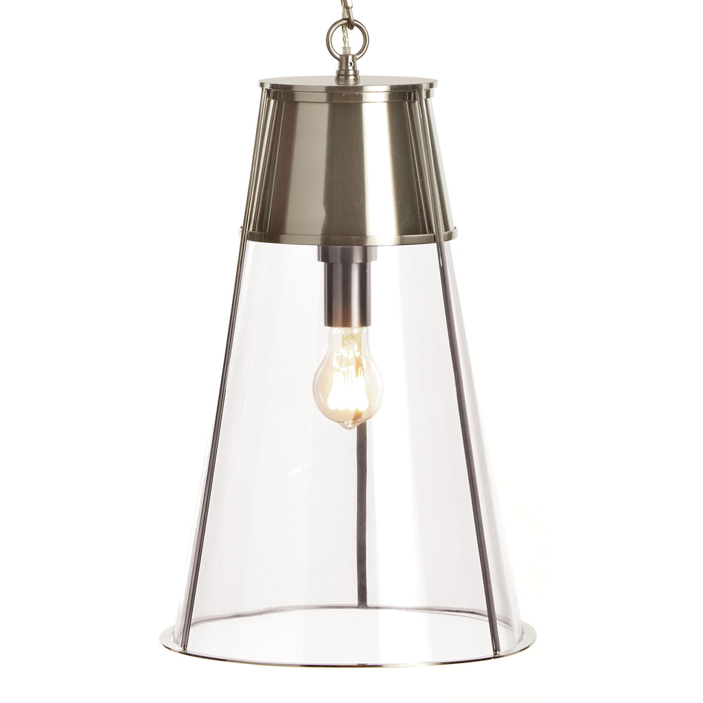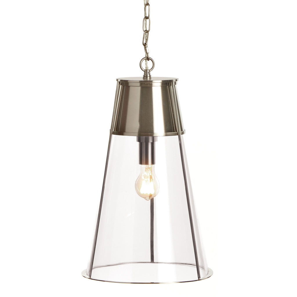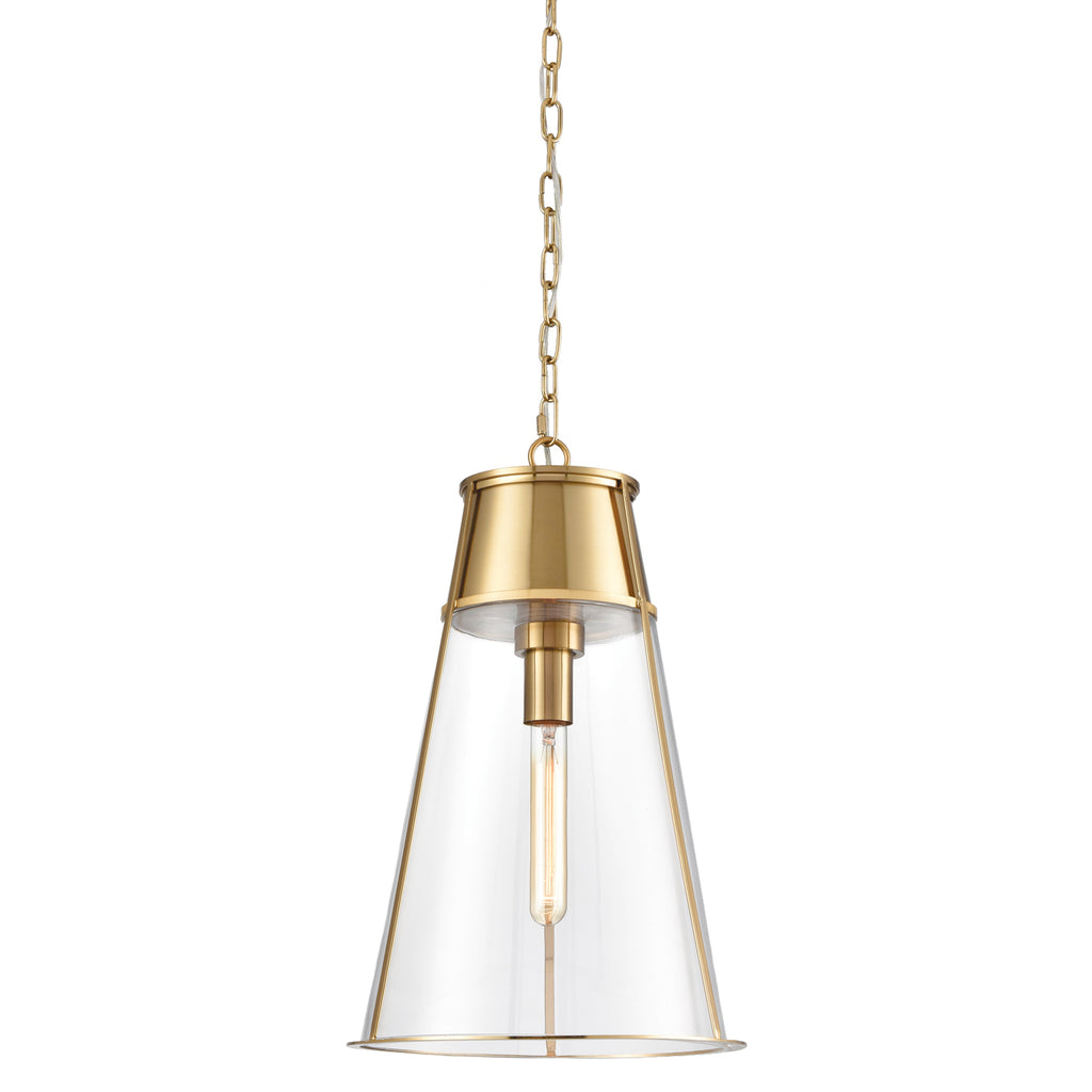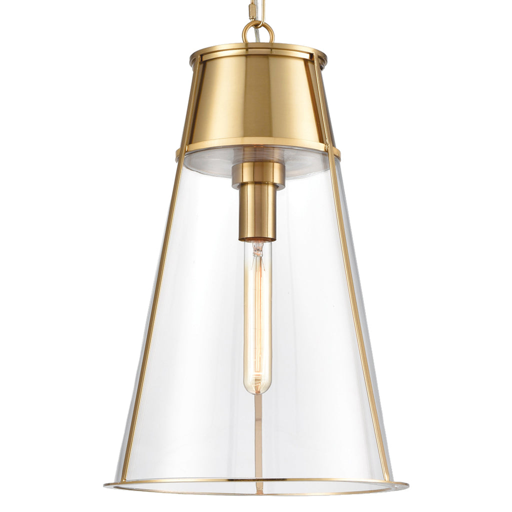 Generous in scale, and made of a modern mi x of brass and glass, this pendant is a handsome fixture. Over an island, in an entry or foyer, a solid choice.