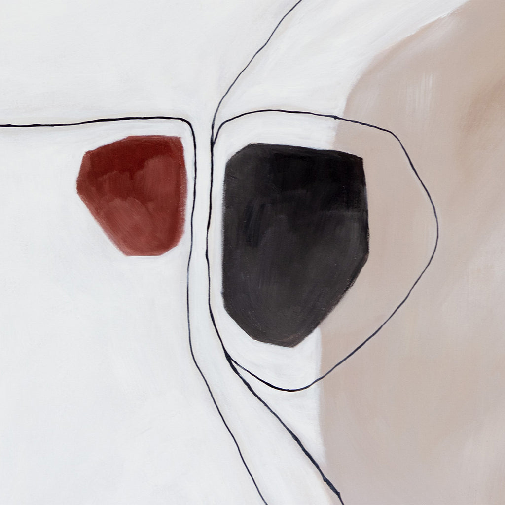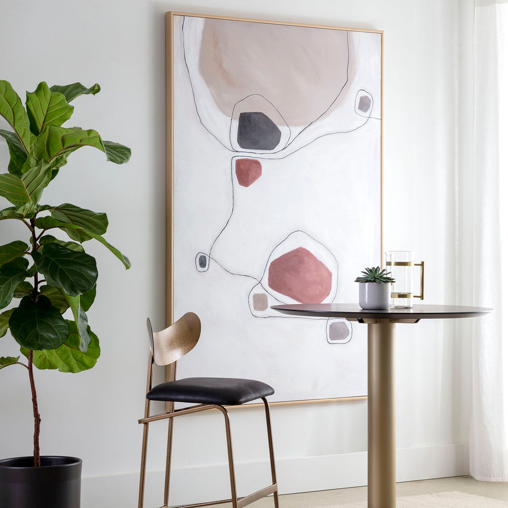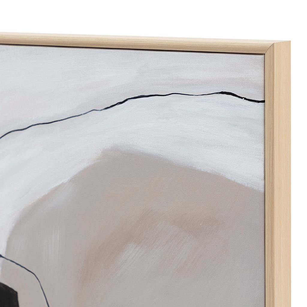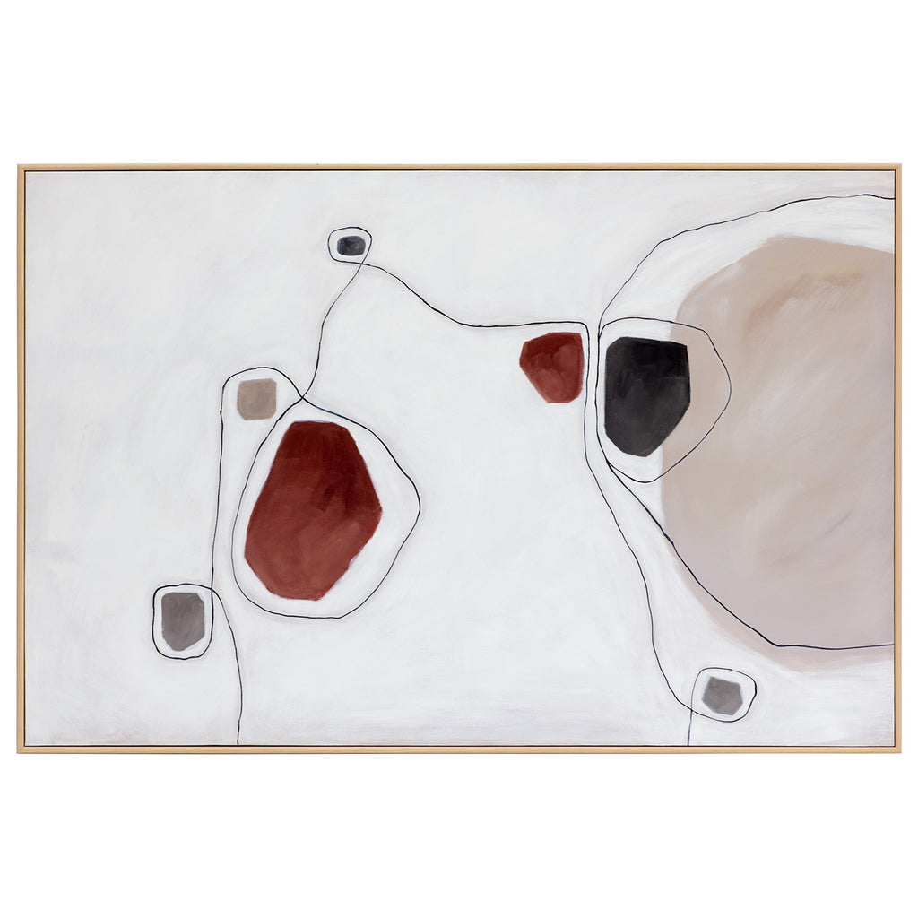 A modern art piece that features thin free flowing lines encompassing muted forms in a terracotta colour palette. Features a natural wood floater frame.