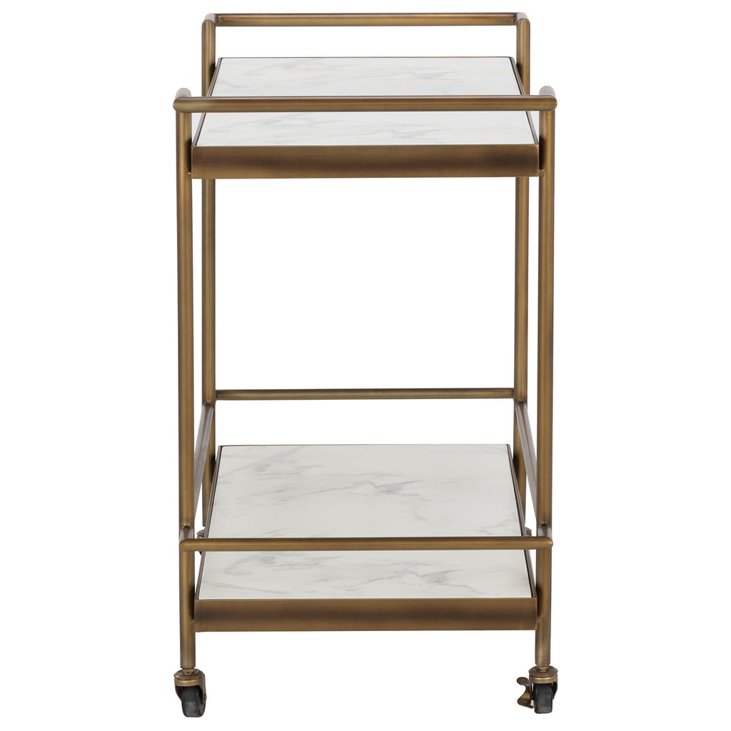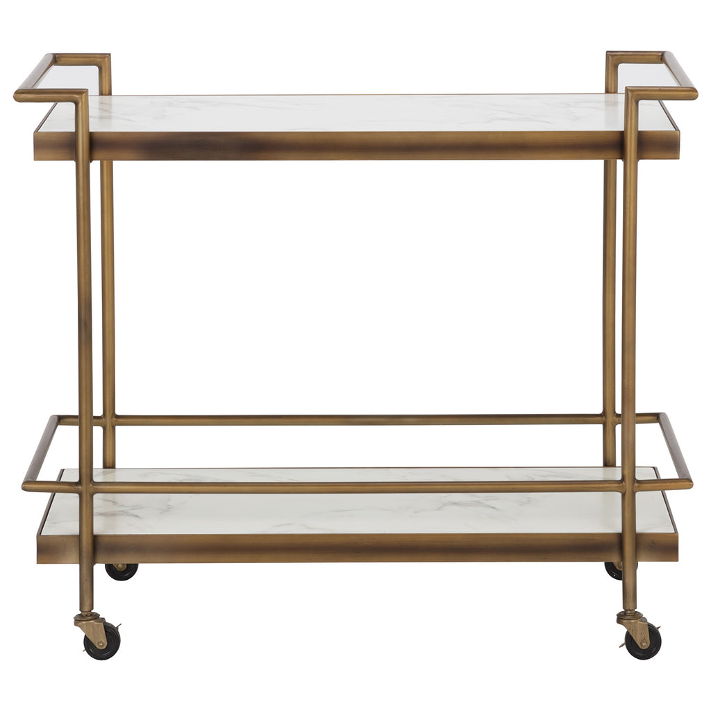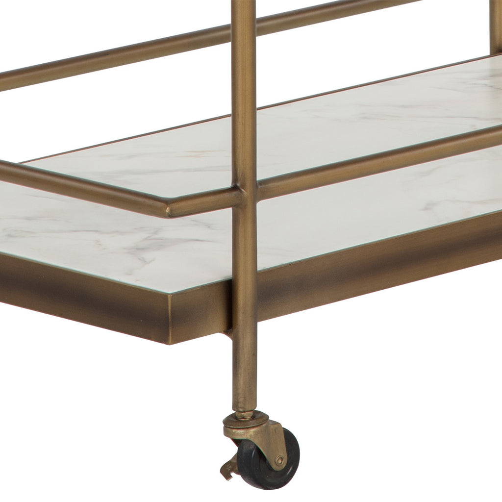 Elegantly display your spirits or drinkware with the Contardi Bar Cart. Built for durability, this bar cart features a powder-coated steel frame with a rustic bronze finish. The bottom and top shelves are made from reinforced concrete with a beautiful white marble look.