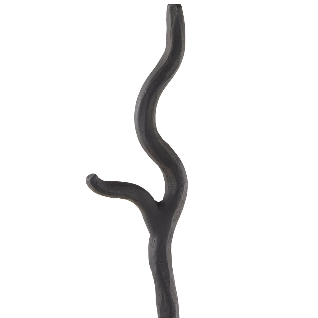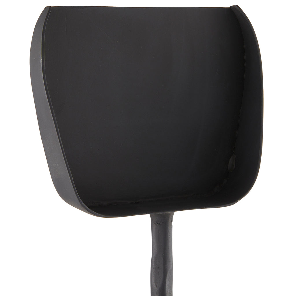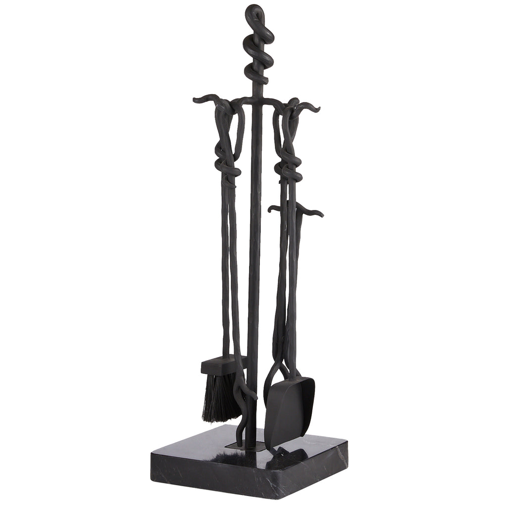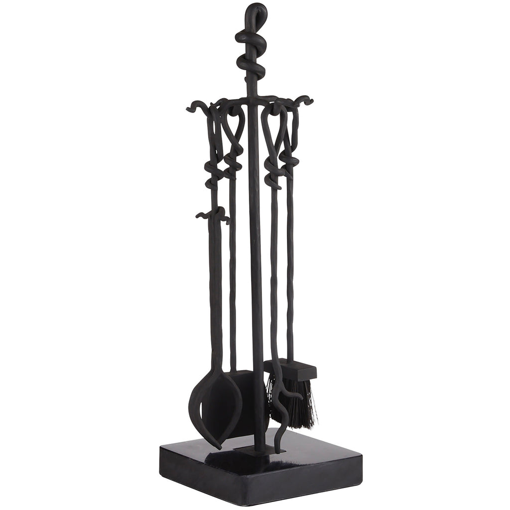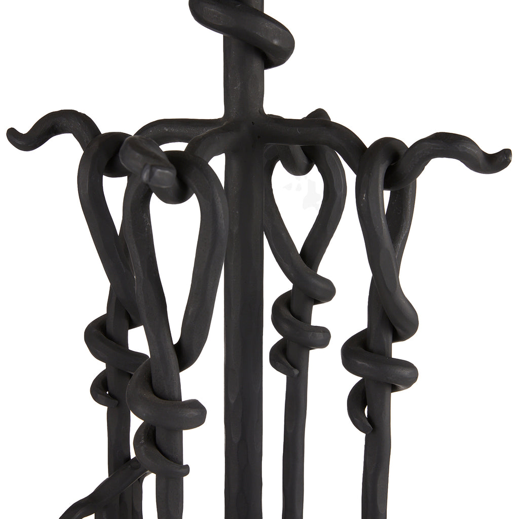 Inspired by medieval ironwork, a blackened, hammered iron toolset offers a playful—and literal—twist on a timeless hearth essential. The angular handles of the poker, shovel, and tongs entwine together in a form reminiscent of the twisted roots of a tree. A matching iron base complements the set. Designed to pair with the Arteriors Denison log holder. Finish will vary.