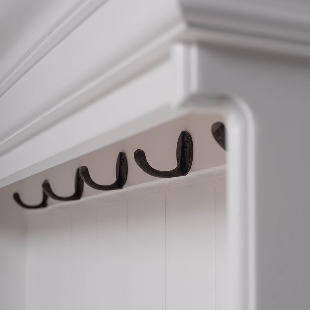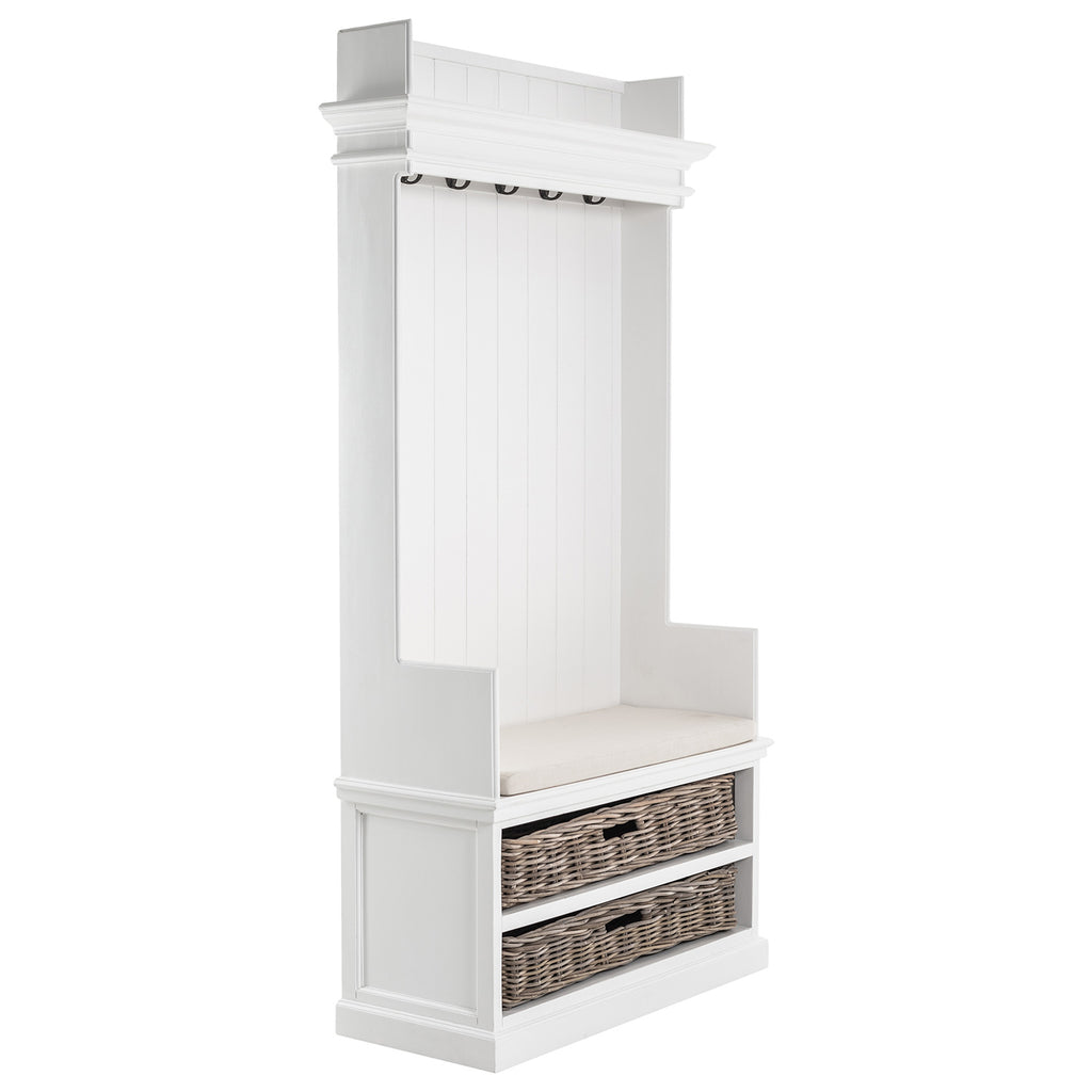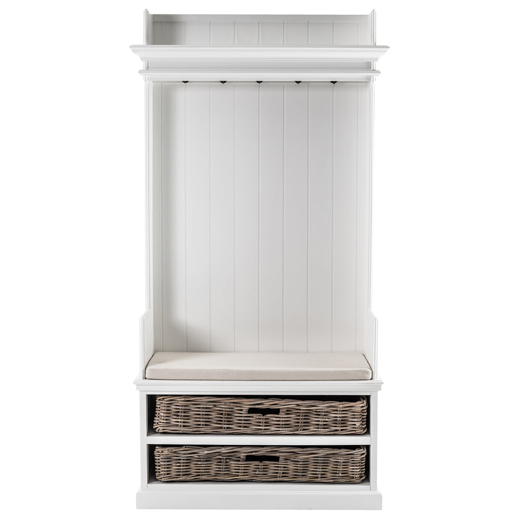 Beckton combines the quaint charm of the French Countryside with the coastal flair of the Eastern Seaboard to form a comprehensive range befitting the dining area, living space or bedroom. Detailed profiling on each piece, together with the warm finishing and antique brass hardware, provides a classic collection for the contemporary home. Keep entryway clutter at bay with this attractive bench and coat rack combo. A cleverly designed shelf, in place above the flared crown molding, tops the unit and offers an unexpected display opportunity. Antique brass hooks can accommodate a number of your guests’ coats or jackets with ease. A seating area is housed above two generous rattan baskets. The included seat cushion adds that extra bit of comfort at day’s end. It is made of durable 100% cotton, with a removable cover for easy cleaning. Handwoven rattan baskets are a picturesque alternative to drawers, and add a rustic, charming flavor.