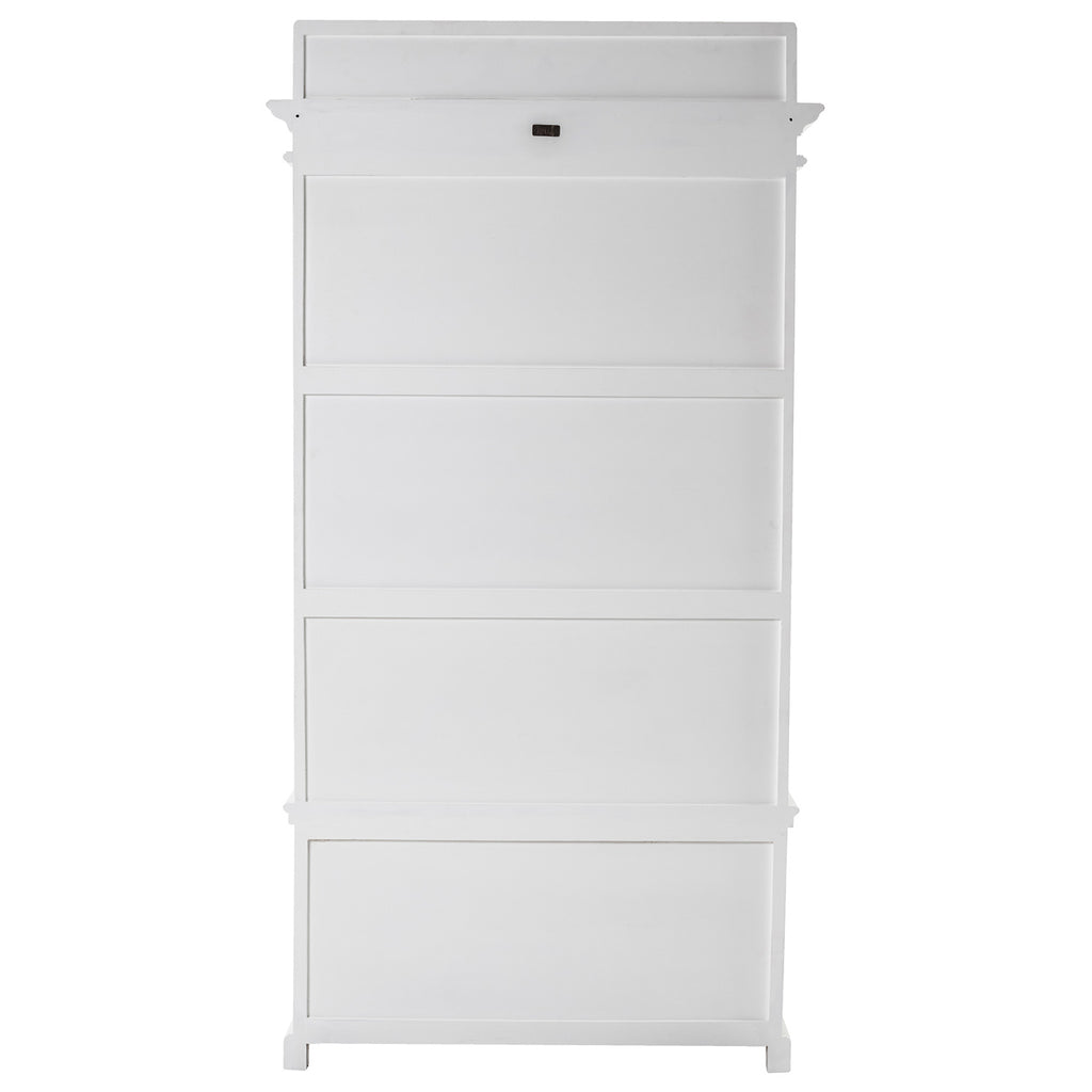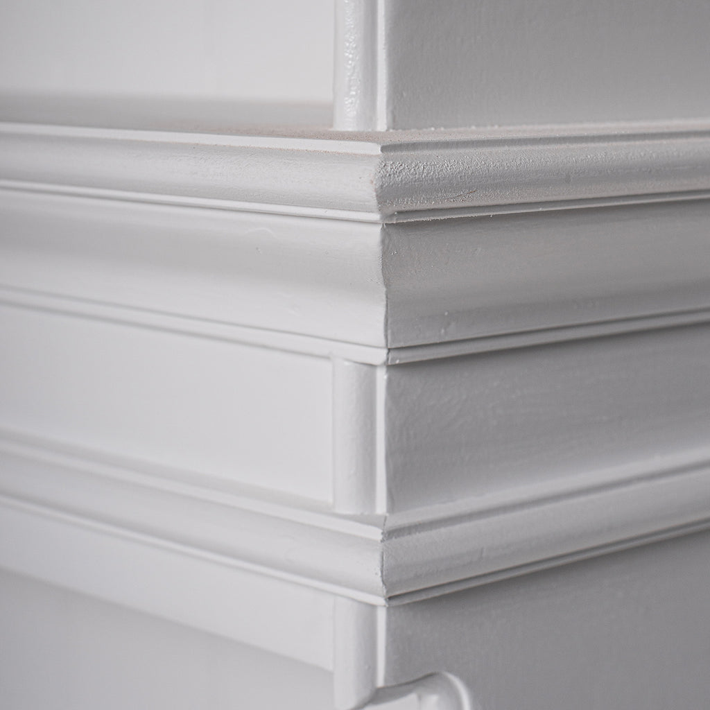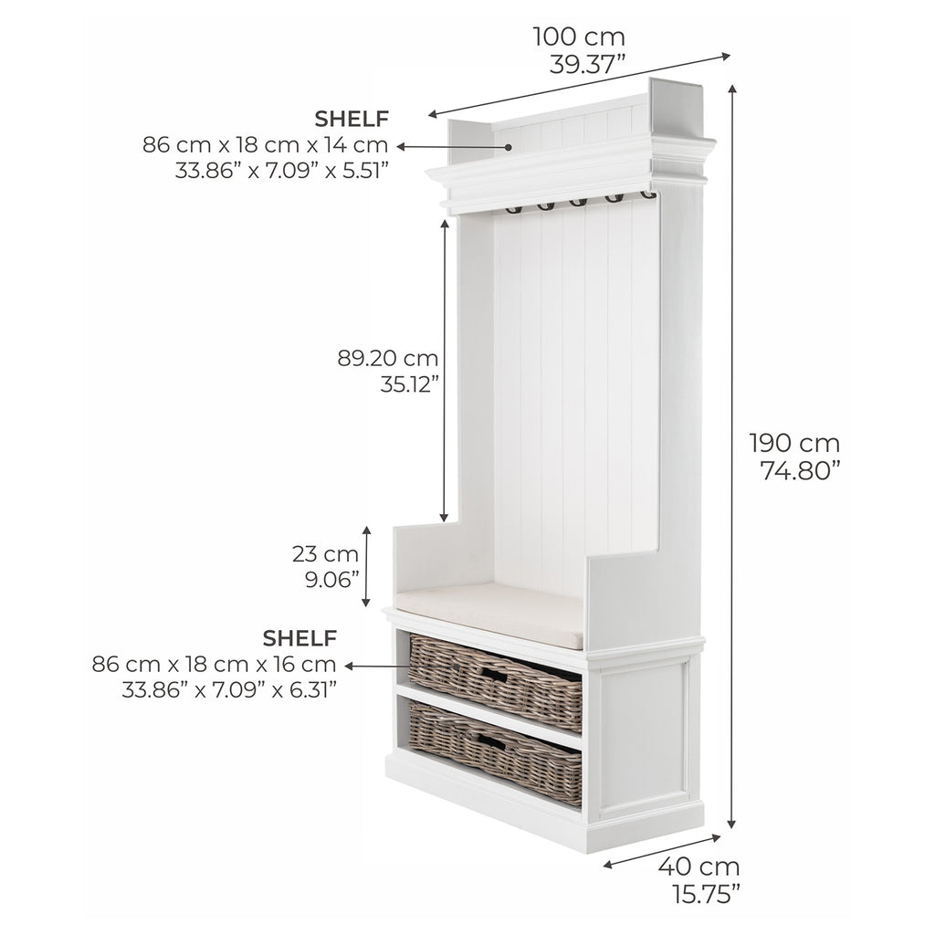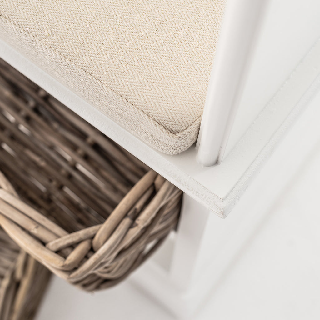 Beckton combines the quaint charm of the French Countryside with the coastal flair of the Eastern Seaboard to form a comprehensive range befitting the dining area, living space or bedroom. Detailed profiling on each piece, together with the warm finishing and antique brass hardware, provides a classic collection for the contemporary home. Keep entryway clutter at bay with this attractive bench and coat rack combo. A cleverly designed shelf, in place above the flared crown molding, tops the unit and offers an unexpected display opportunity. Antique brass hooks can accommodate a number of your guests’ coats or jackets with ease. A seating area is housed above two generous rattan baskets. The included seat cushion adds that extra bit of comfort at day’s end. It is made of durable 100% cotton, with a removable cover for easy cleaning. Handwoven rattan baskets are a picturesque alternative to drawers, and add a rustic, charming flavor.