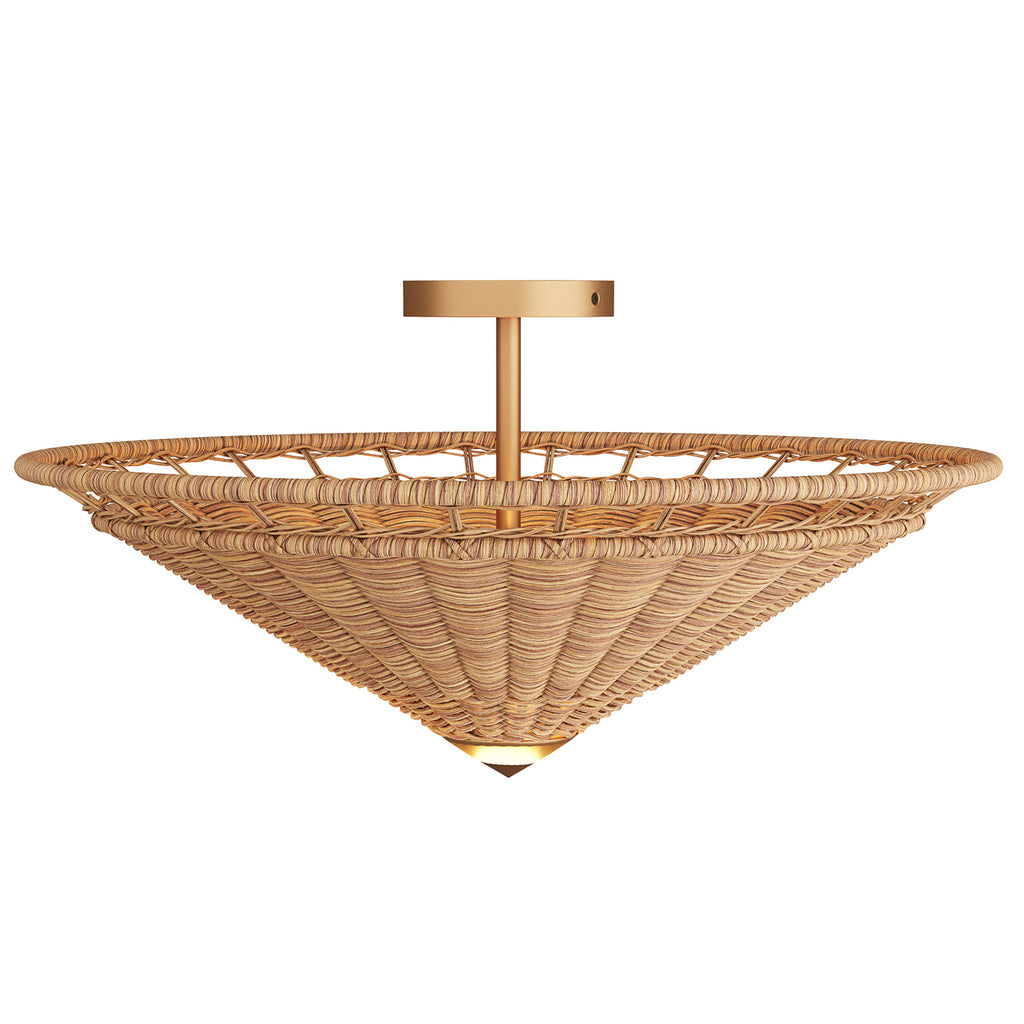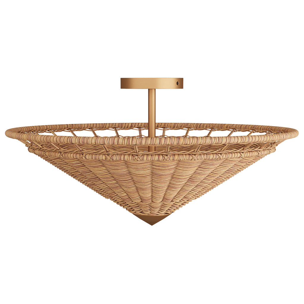 A continuation of the terrace family, this flushmount is made up of natural, handwoven rattan. The ceiling mount and centerpoint tip are crafted of gold steel finished iron that contrast the whimsical silhouette. Finish will vary.