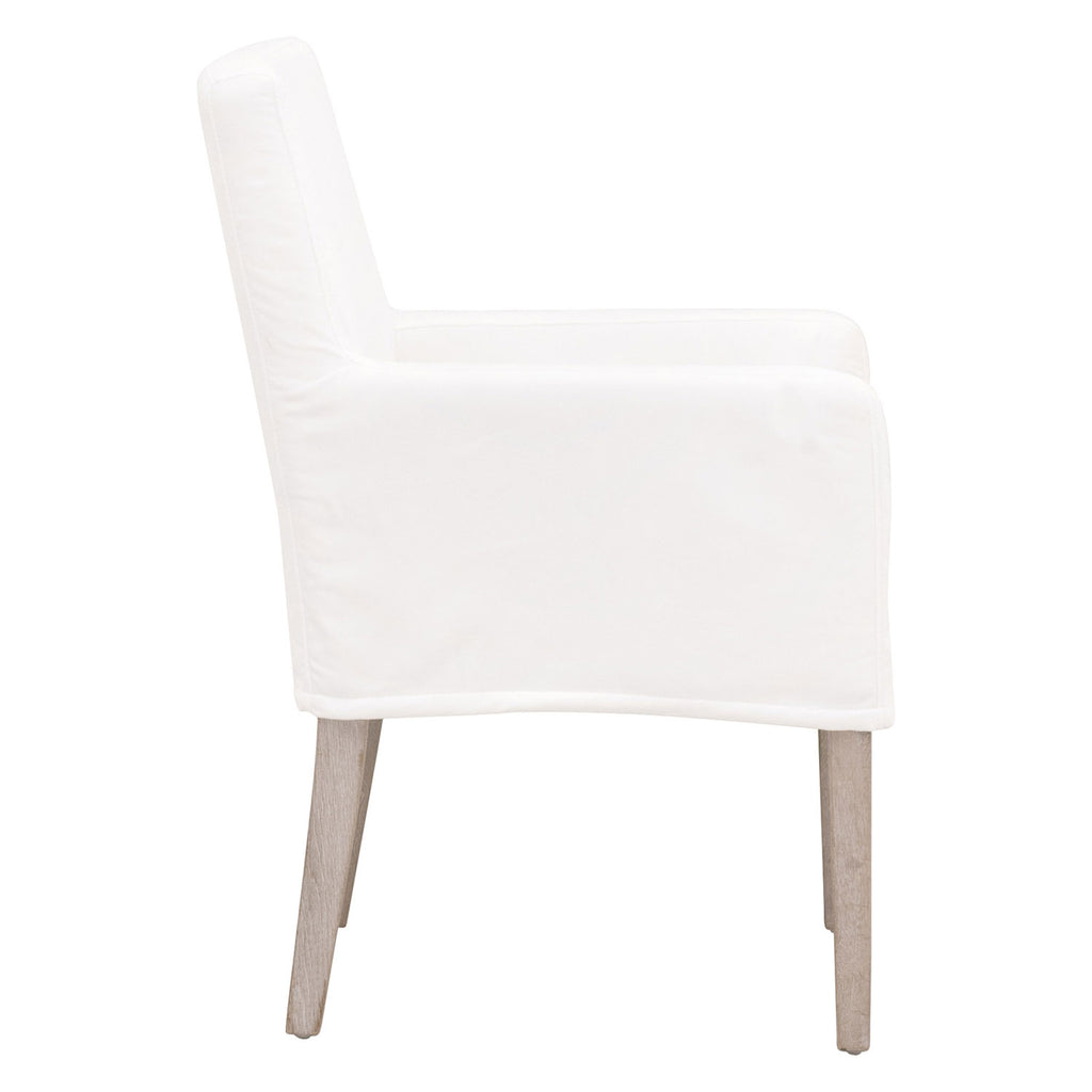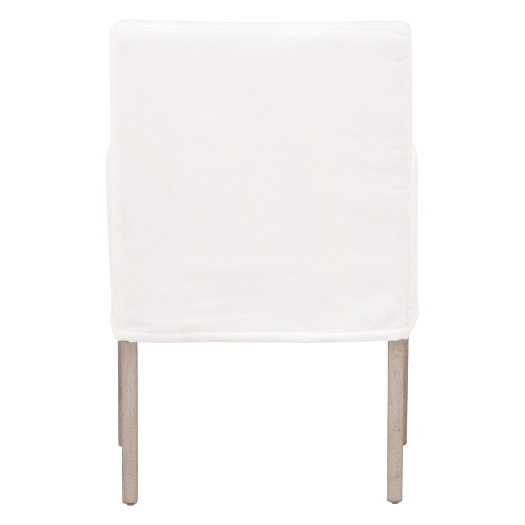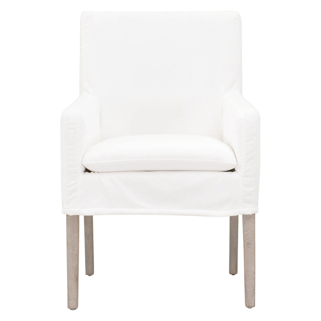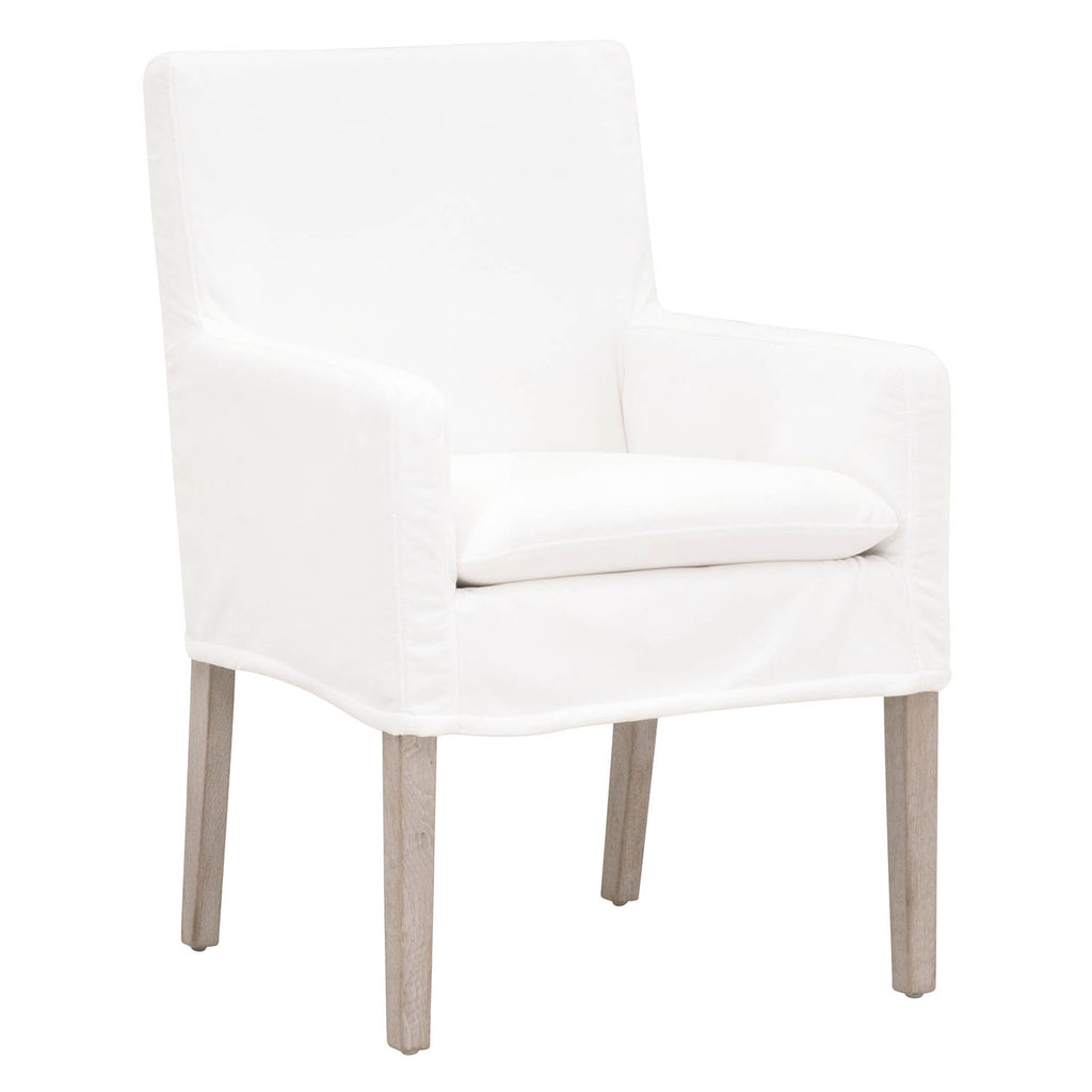 Made with a high-performance fabric, the Essentials for Living Drake slipcover arm chair is both durable and versatile. The plush seat cushion is attached to the chair with knife edging. The cushion is filled with a high-density foam that make this chair pleasantly comfortable for sitting. The solid wood base is constructed with solid oak with natural gray undertones, perfectly complementing the white fabric. Adaptable to many settings, this arm chair can be used as a dining chair, accent chair or desk chair. Its transitional style, appealing tones, and ultra-cozy seat easily make this chair a great fit for any dining or living space.