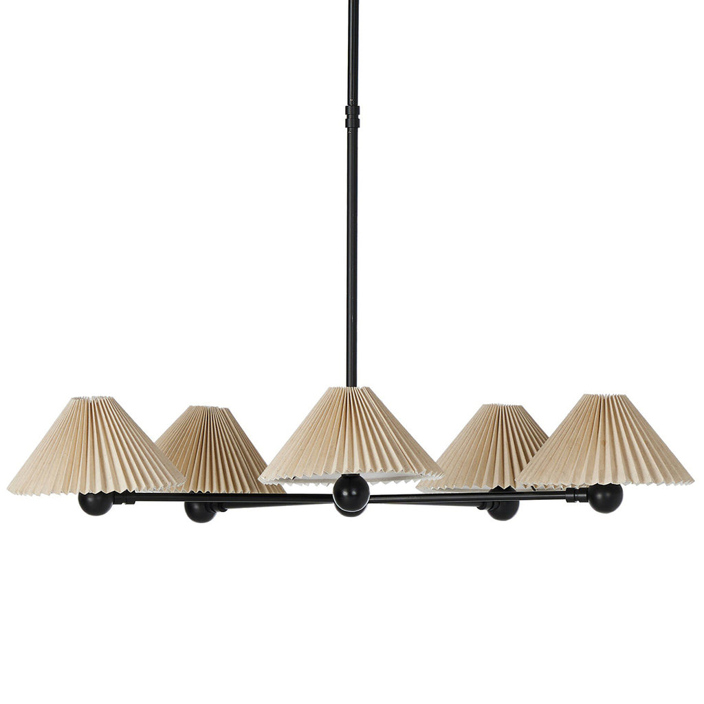 Soft accordion-pleated shades float above industrial-inspired metal caps and ball details that define this five-arm chandelier. A clever double hook allows for angled ceiling installation.