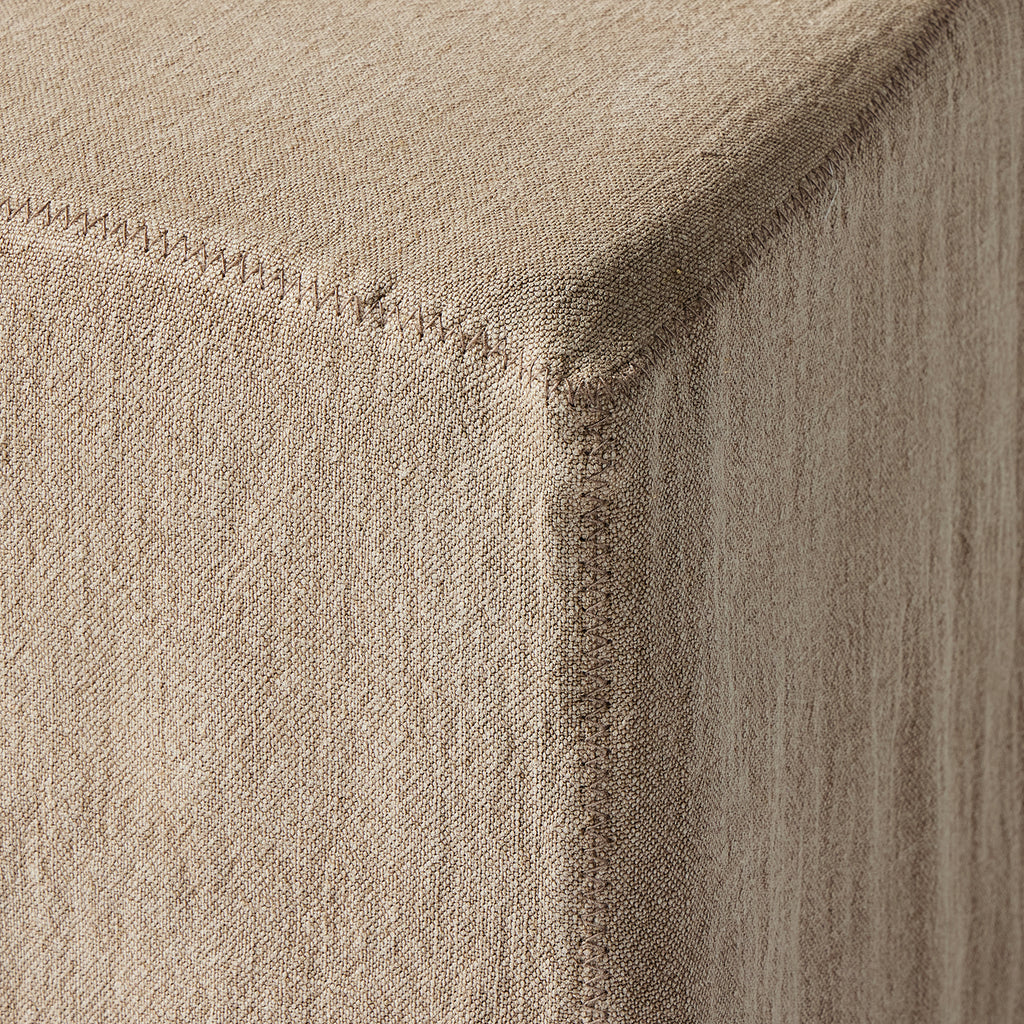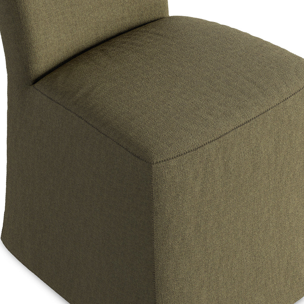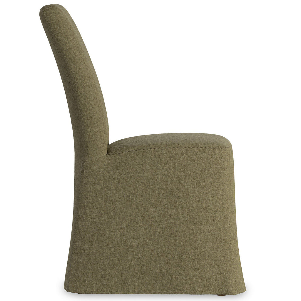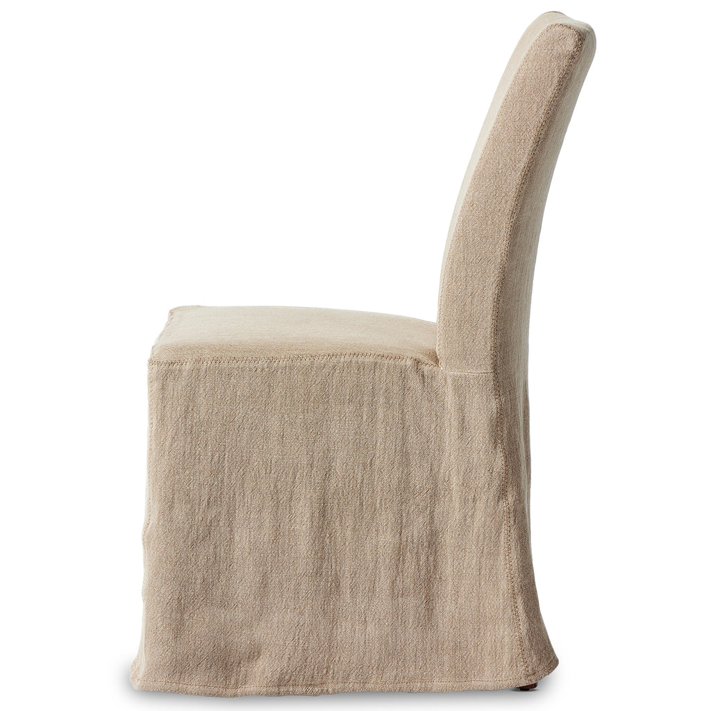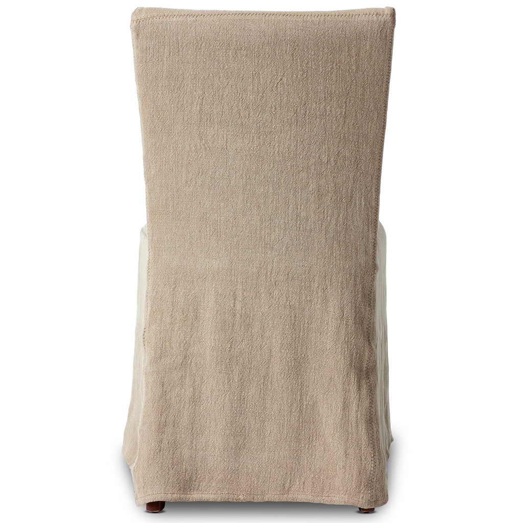 A slipcovered dining chair delights with a tall, curved silhouette and a flax linen fabric in a neutral hue.