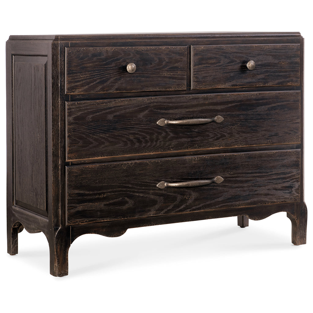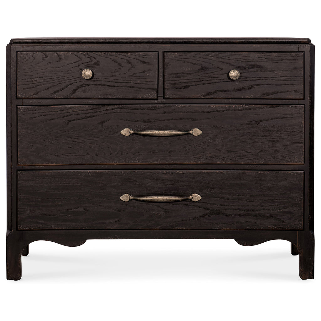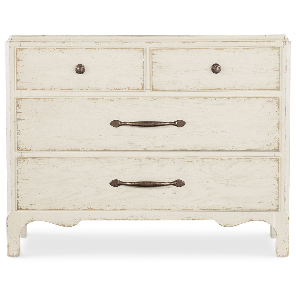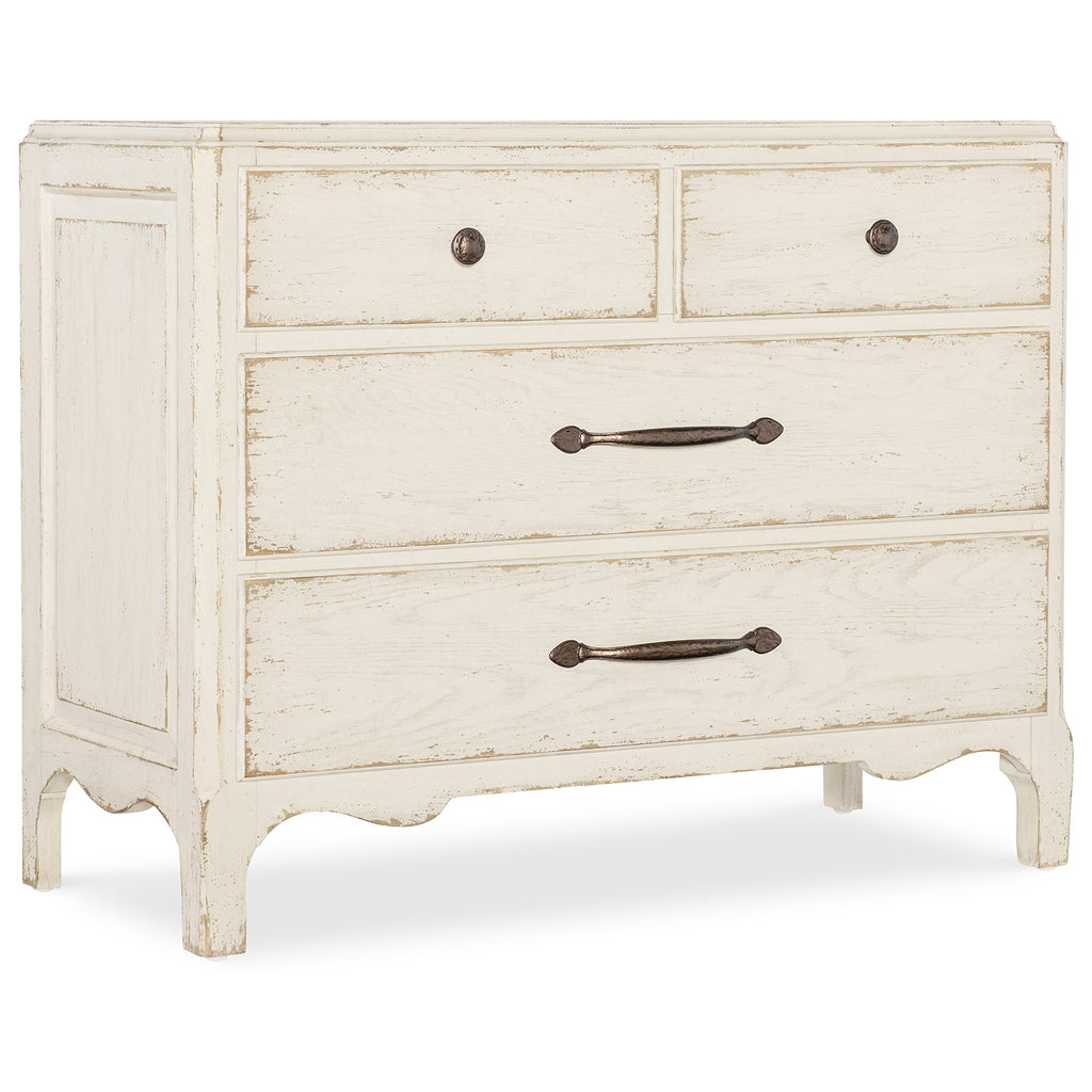 In a classic, charming design with a nostalgic flair, the Americana Bachelor Chest is reminiscent of a simpler, more genteel time. It has a scalloped shaped base and is finished in the timeworn white Daisy finish or Molasses on Cathedral Oak Veneers.