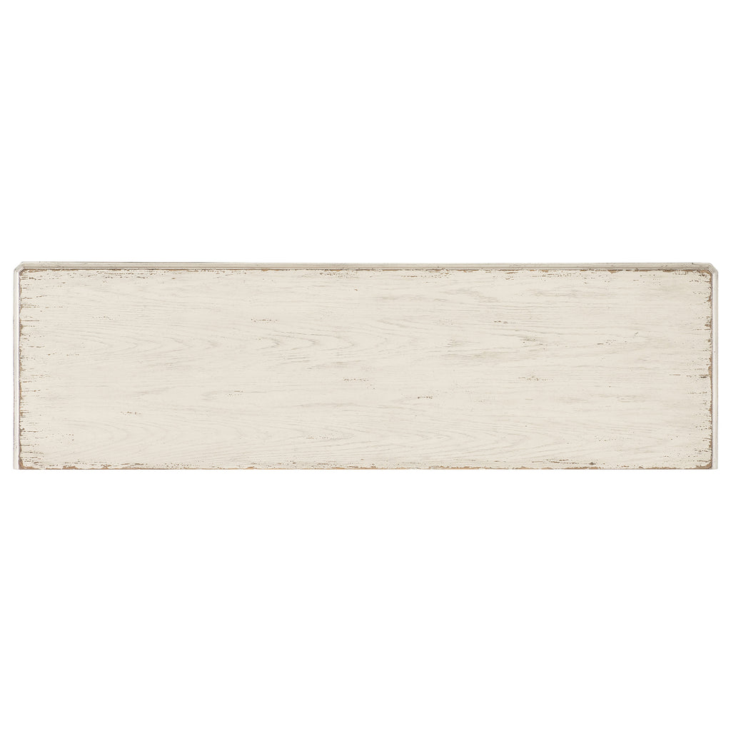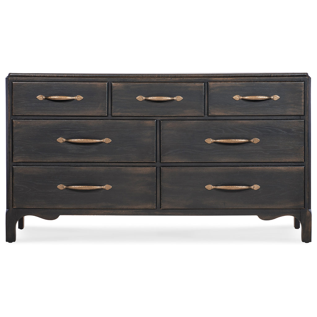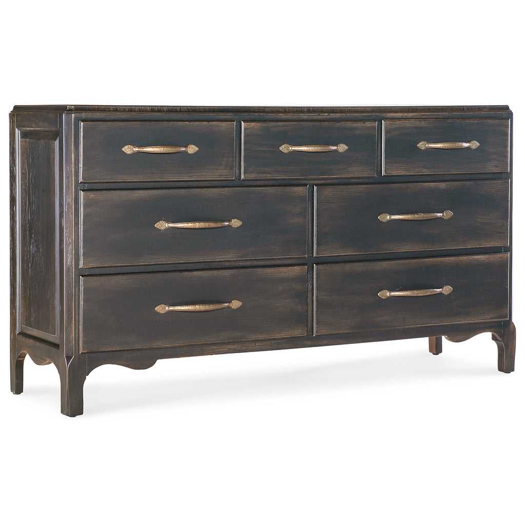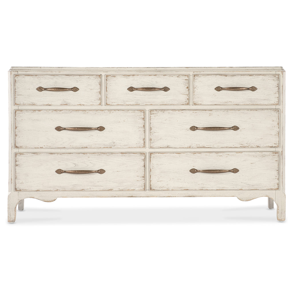 In a classic, charming design with a nostalgic flair, the American Dresser is crafted of Oak Veneers with a Solid-Wood Edge Top, a scalloped-shape base and finished in the time-worn white Daisy or Dark Molasses. There are 7 self-closing drawers, with the top left and right drawers with black removable felt liners. The center drawer has a black liner and black removable jewelry tray. The bottom two drawers are cedar-lined. Metal alloy pulls are in an antique bronze finish.