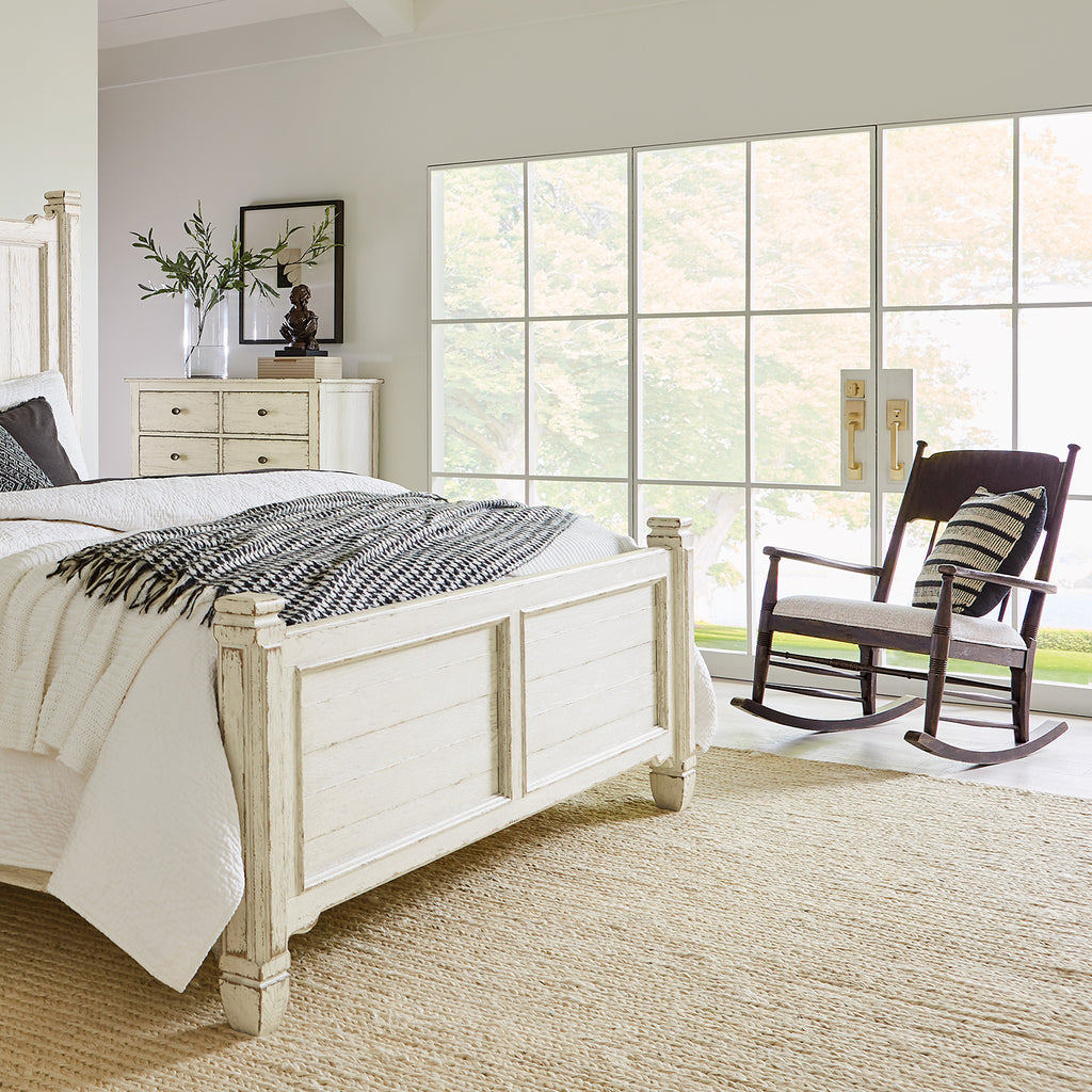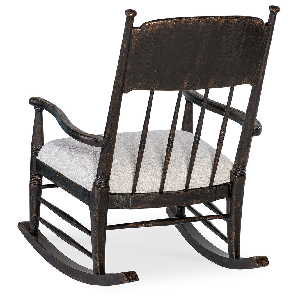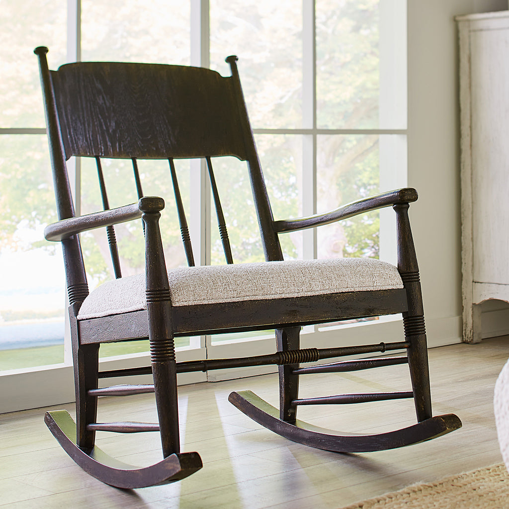 Celebrating the winsome beauty of a simpler time, the Americana Rocking Chair has a back with carved accents on the seat and frame. Crafted of Oak Veneers with a fabric seat trimmed in welt, it is finished in Molasses, a tone that captures the essence of a well-loved heirloom passed down through the generations. The deep dark tone over the Oak Veneers adds warmth, while the variations in color reveal the natural beauty of the wood beneath.