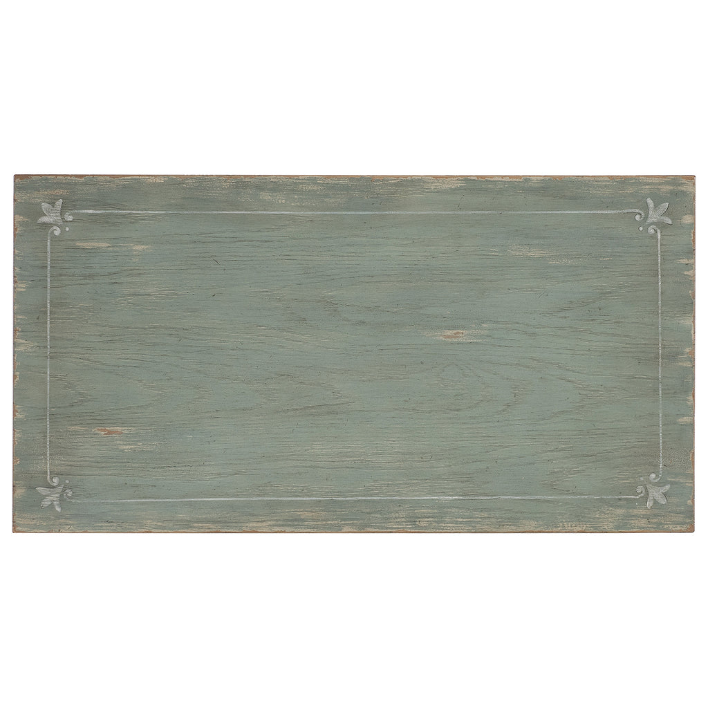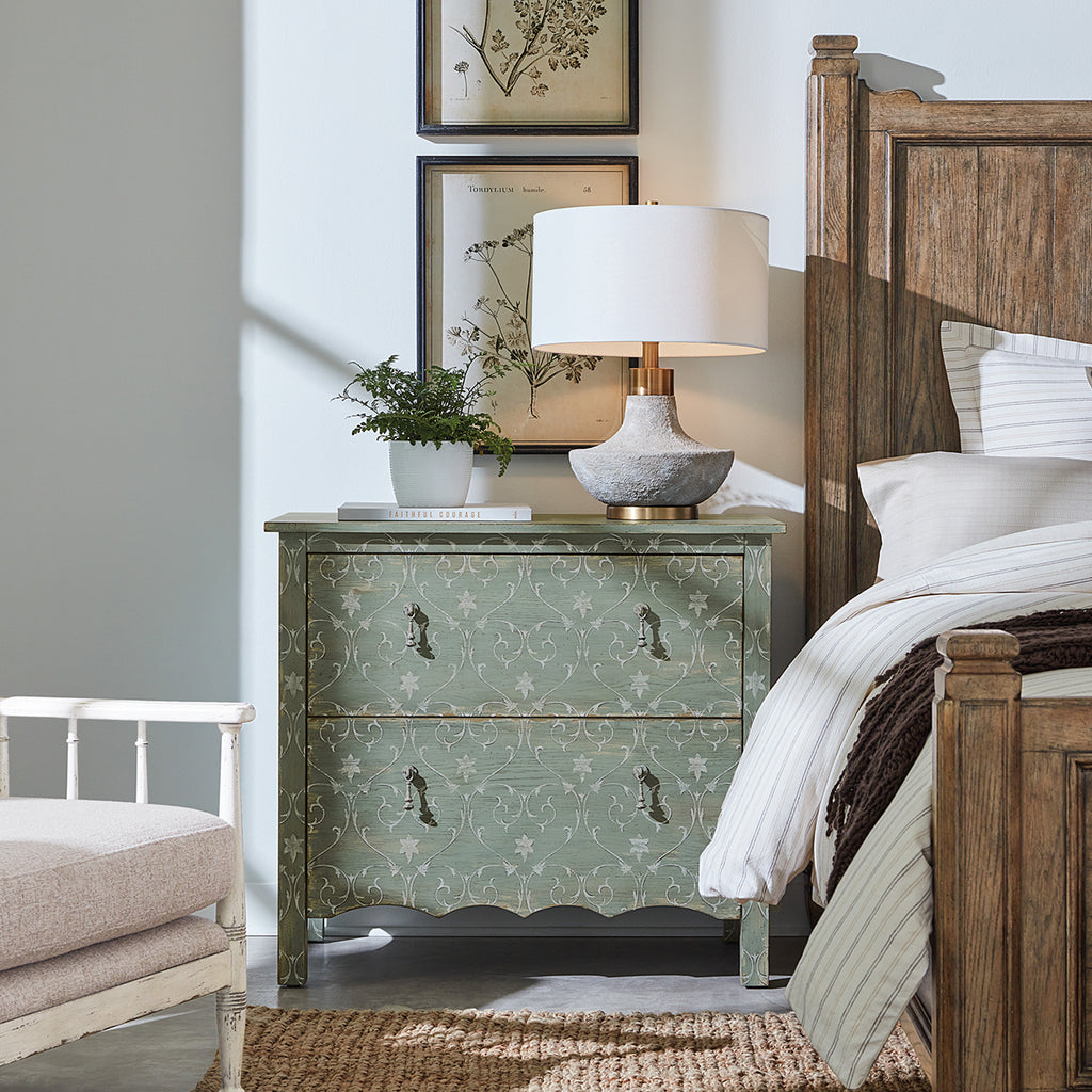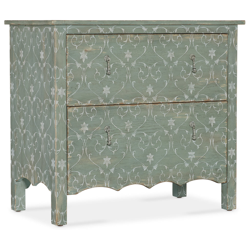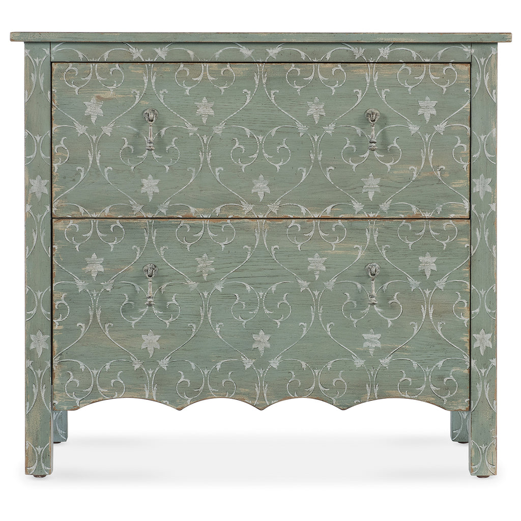 In a classic, charming design with a nostalgic flair, the Americana Two-Drawer Accent Chest has a scalloped-bottom shape and is finished in a soft Antique Green with distressing and rub-through over Oak Veneers. A white scroll pattern covers the exterior, and the interior has a Honey finish.
