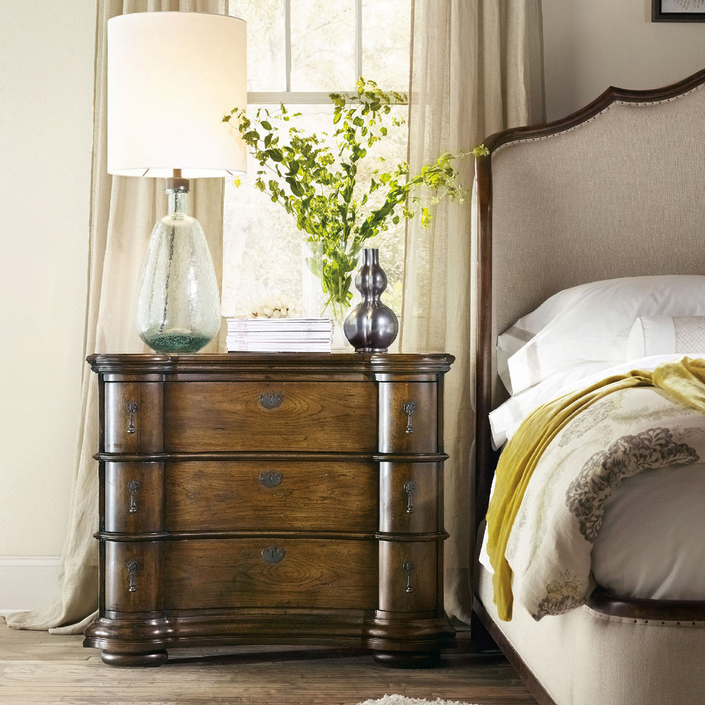 A softly curving concave front, ornamental shield-shaped escutcheon hardware and tear-drop-shaped pendants in a time-worn bronze color, along with chic bun feet, come together to create a piece that embraces both grand elegance and beloved, time-honored forms. Featuring a soft casual pecan-colored rustic finish, practical storage is offered in this chest with its 3 roomy drawers, including a cedar-lined bottom drawer and drop-in felt liner in the top drawer. There’s also a touch-light with dimmer switch and cord clip for electronics.