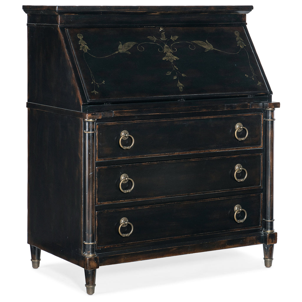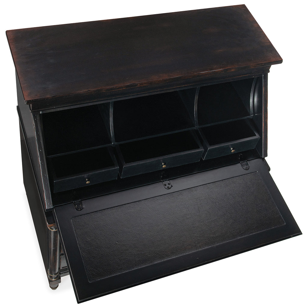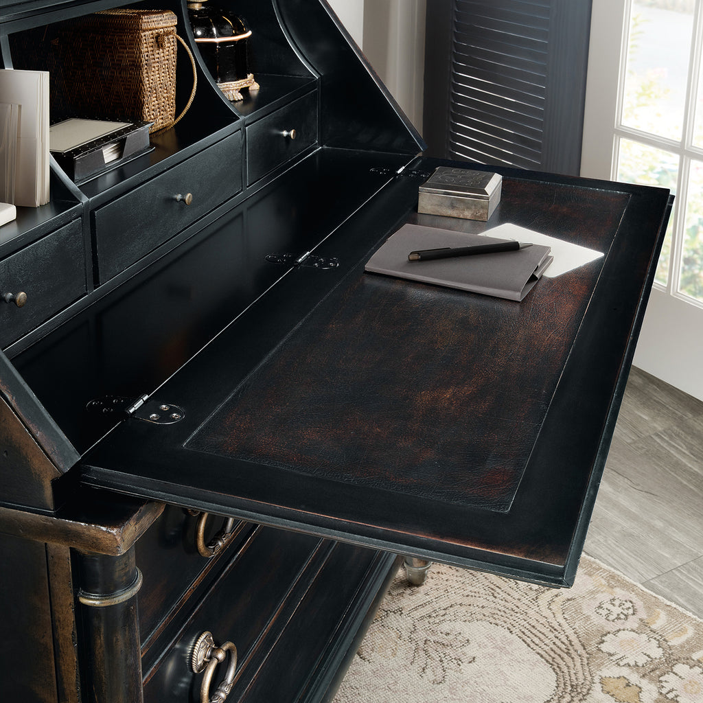 Inspired by the classic coastal charm and rich history of Charleston, this venerable secretary is finished in the heirloom-quality Black Cherry dark patina. Accented by handpainting on the drop-front lid, the secretary features a robus leather writing insert, 3 cubbies for storage and 3 small drawer the drop-front, along with 3 lower drawers with self-closing drawer guides and cherry-colored interiors. Pewter-colored pulls.