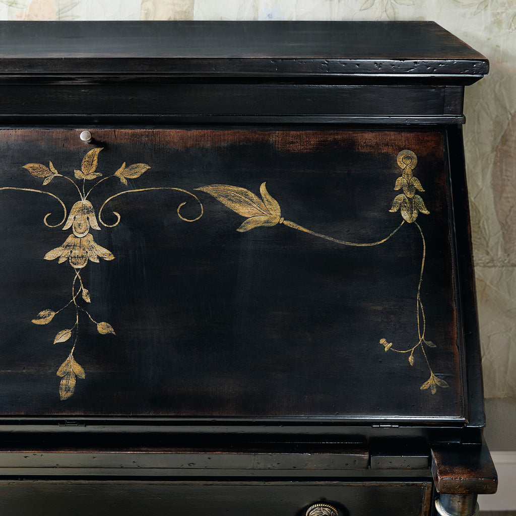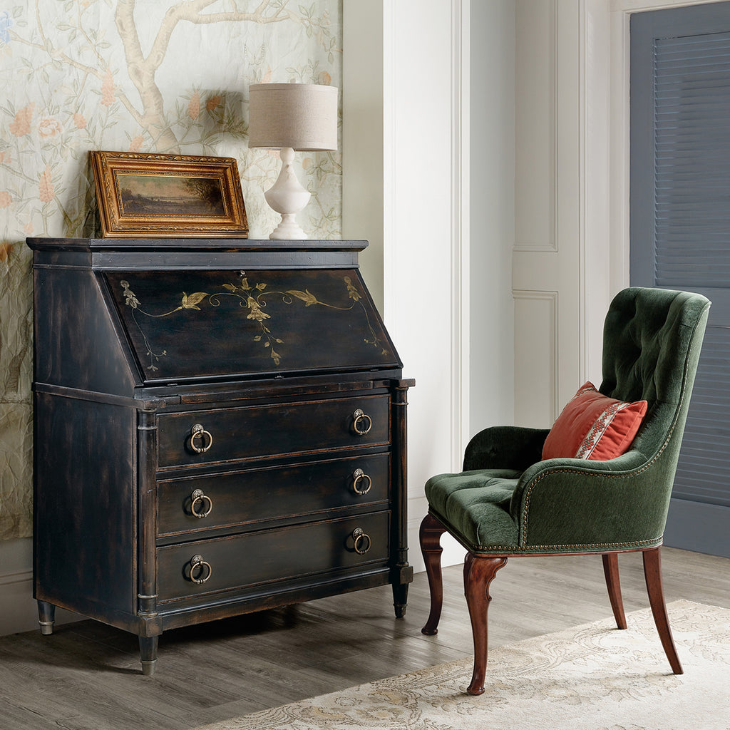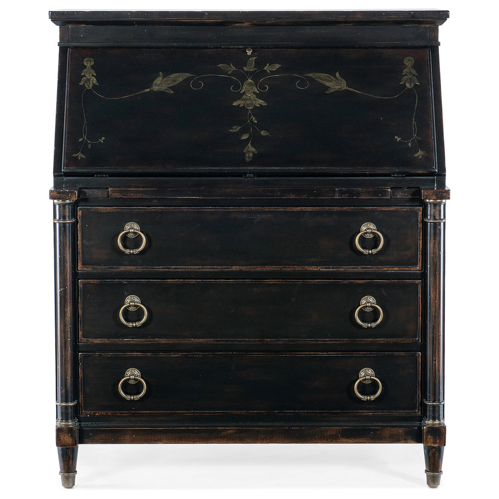 Inspired by the classic coastal charm and rich history of Charleston, this venerable secretary is finished in the heirloom-quality Black Cherry dark patina. Accented by handpainting on the drop-front lid, the secretary features a robus leather writing insert, 3 cubbies for storage and 3 small drawer the drop-front, along with 3 lower drawers with self-closing drawer guides and cherry-colored interiors. Pewter-colored pulls.