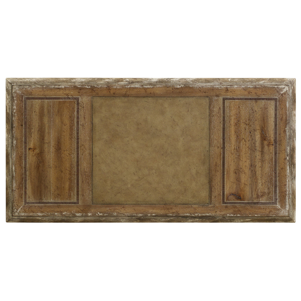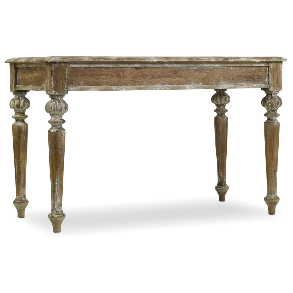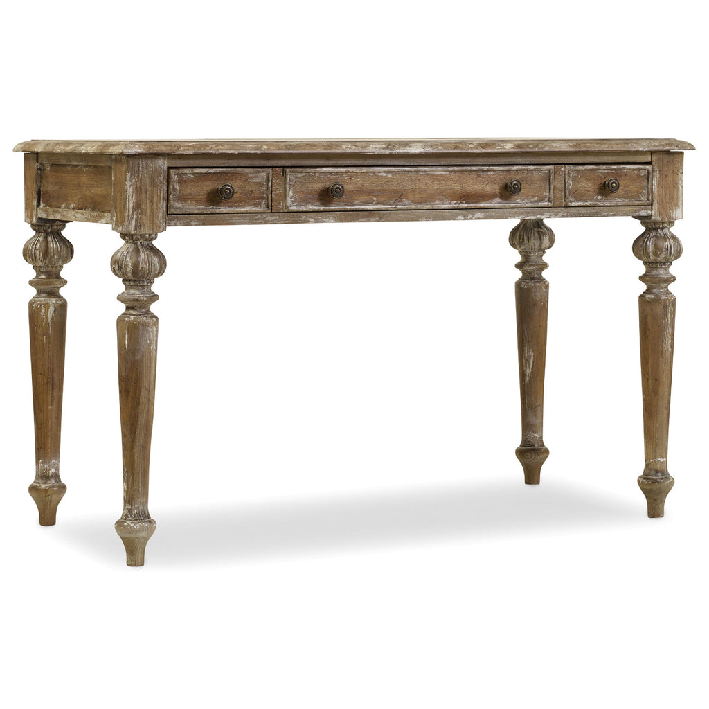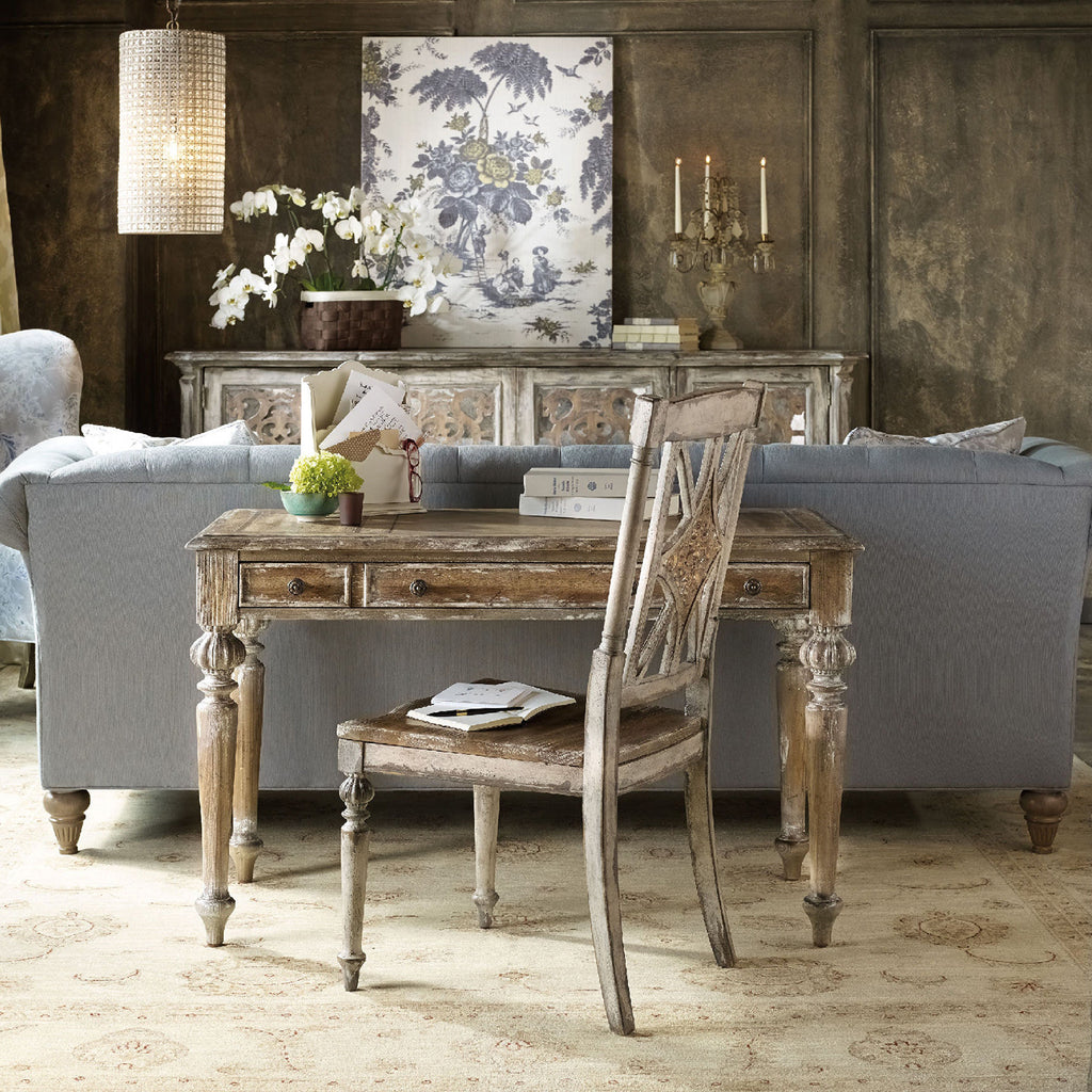 The perfect size to tuck your sofa, in the kitchen or extra bedroom, the Chatelet Writing Desk may be a space saver, but spares nothing on function and style. Infuse your room with rustic elegance with this graceful silhouette, finished in a soft amber color with a touch of aged white paint. Features include a leather writing surface and a center drawer with drop-front for keyboard use.