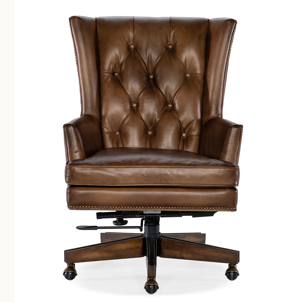 Vintage and venerable, the Finley Executive Chair is timeless with a diamond-patterned tufted back, understated wings, nailhead and welt trim and upholstered in the warm Checkmate Pawn aniline top grain leather. The wood base is in a rich dark finish. On casters.