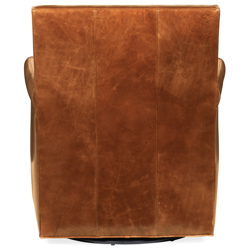 The Jilian Swivel Club Chair exudes sink-in-me comfort with a plush seat cushion and a supportive high back. Upholstered in the warm caramel-colored aniline top grain Huntington Morrison leather, the chair is accented with bronze nailheads.