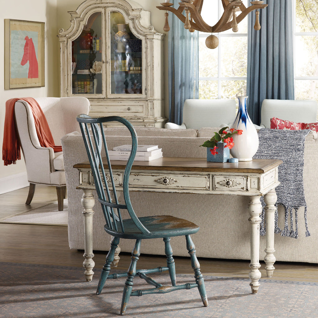 With a casual chic spin on classic European farmhouse and cottage style, the graceful silhouette of the Sanctuary Spindle Side Chair is destined to be a favorite. The compelling Sky High Azure Blue finish with rub through and a gently-worn antique patina, adds the charm.