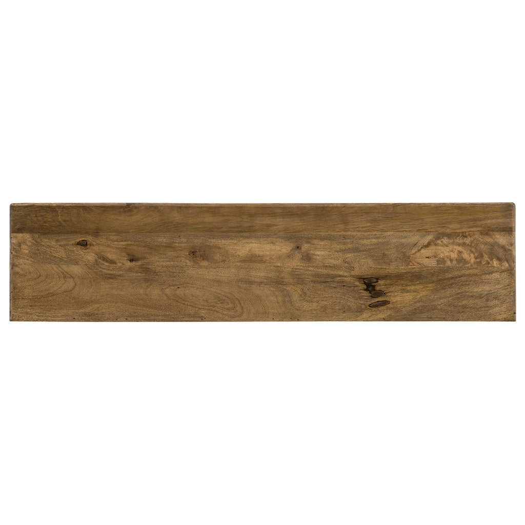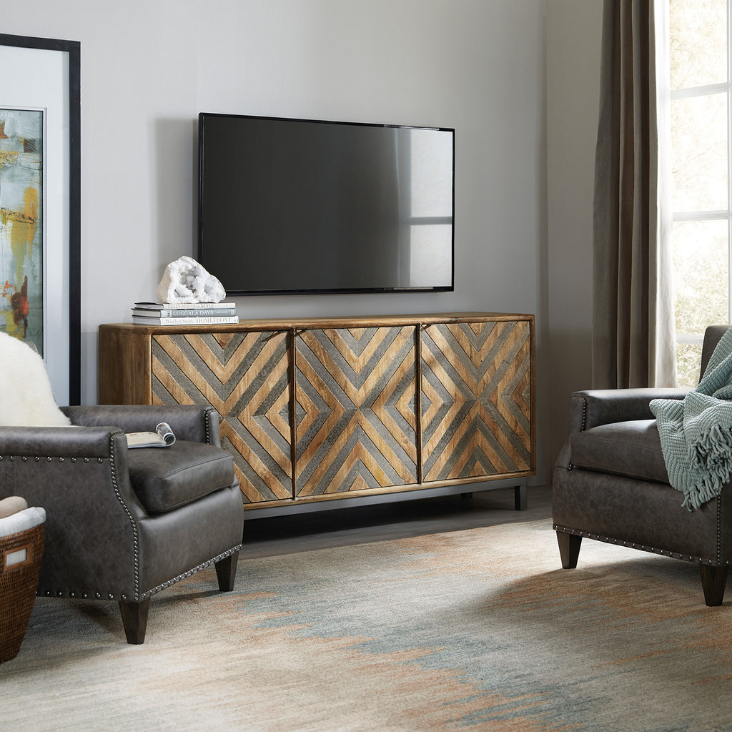 With a chic designer look for sophisticated casual appeal, the Serramonte Console is crafted of Mango Wood and features a German silver metal chevron-patterned inlay on the front with dark pewter-colored European pulls. Accommodating up to a 70-inch TV, the console has 3 doors and 3 removable shelves with a ventilated back panel.