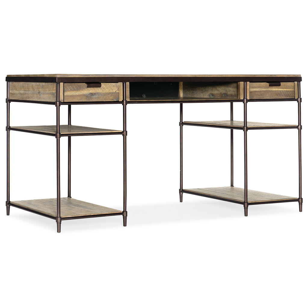 Sophisticated and stylish, the St. Armand Writing Desk would be at home In a loft or studio office with its combination of Acacia Solids and metal tube. This functional piece has 2 drawers, one removable writing insert and pencil tray for use in either drawer, 3 removable dividers in each drawer and 4 wood shelves, along with a center open area for the keyboard.