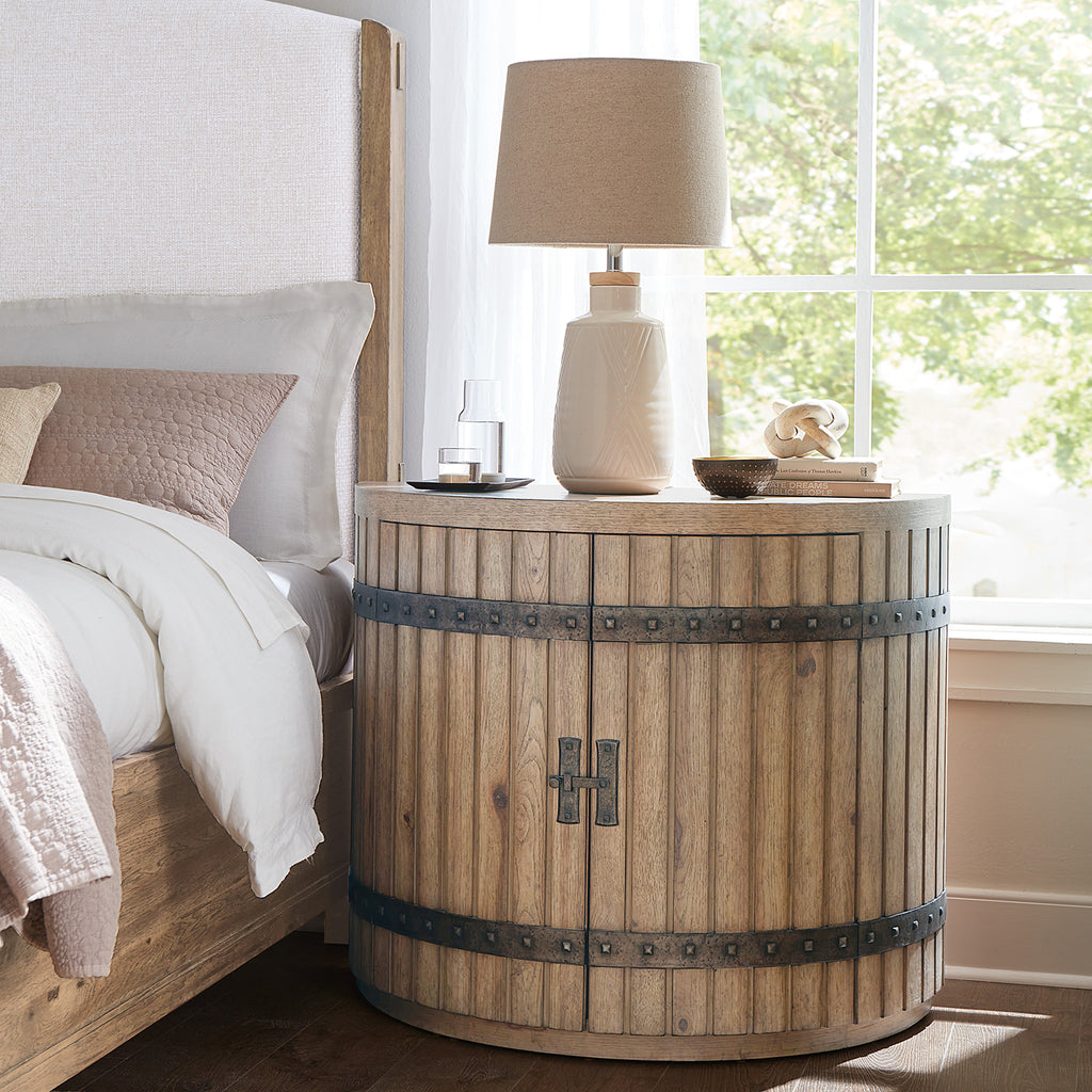 Designed in a half-circle shape inspired by a wine barrel, the Vineyard Row Demilune Nightstand is crafted of Pecky Hickory Veneers finished in the light and airy Sonoma and accented by rustic hammered metal and interlocking pulls. The two doors have soft-close hinges and magnetic door catches. Two adjustable wood shelves.