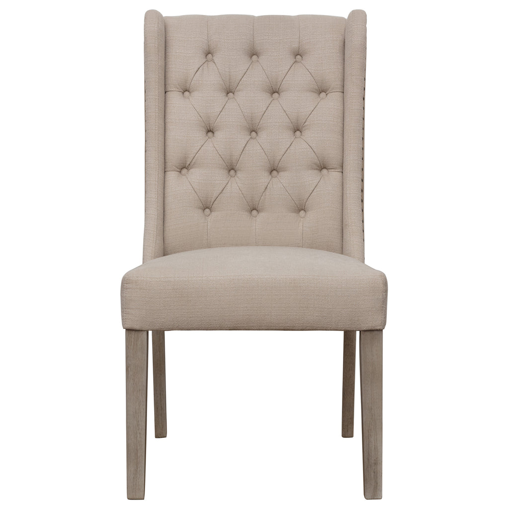 Classic charm and elegance adorn this luxurious, tufted dining chair. Wrapped with a light sand, linen blend upholstery and light brown jute on the back, this armless dining chair features a classic wingback silhouette and a foam filled seat for extra support. Diamond tufting and nail head trim complete the tailored look and traditional feel. Featuring four tapered rubberwood legs in a light warm wash finish.