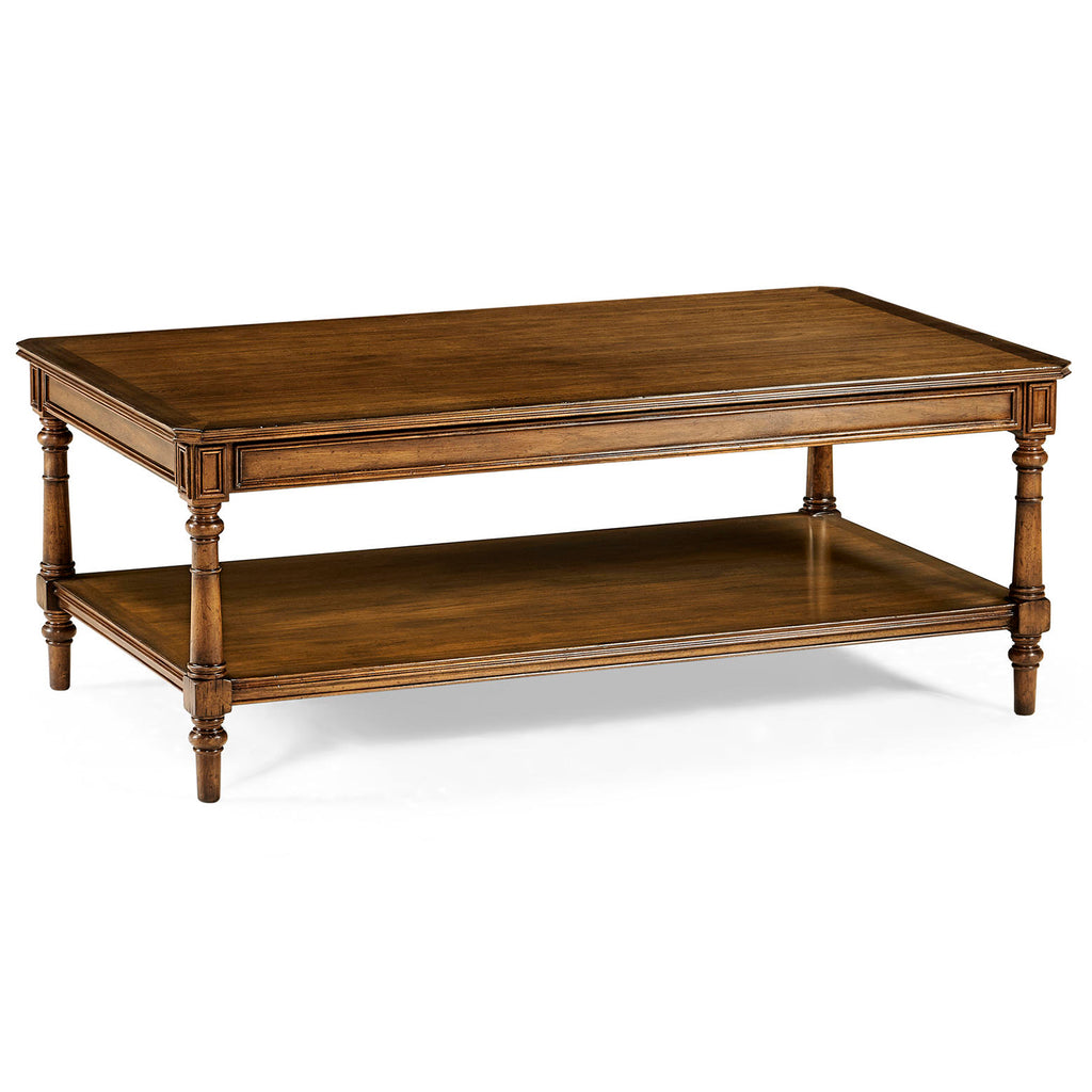 Rectangular walnut coffee table, the top with canted corners set above a paneled frieze and turned baluster legs around an under tier.