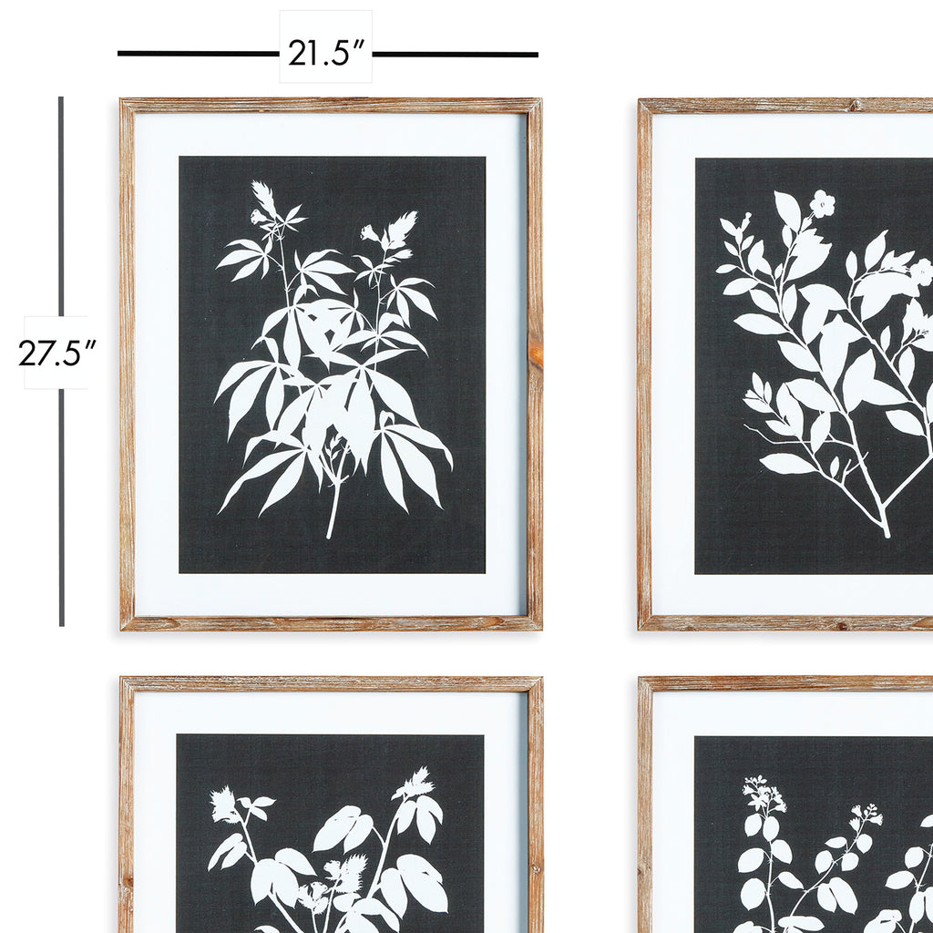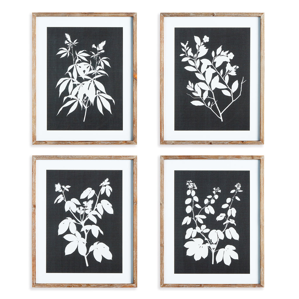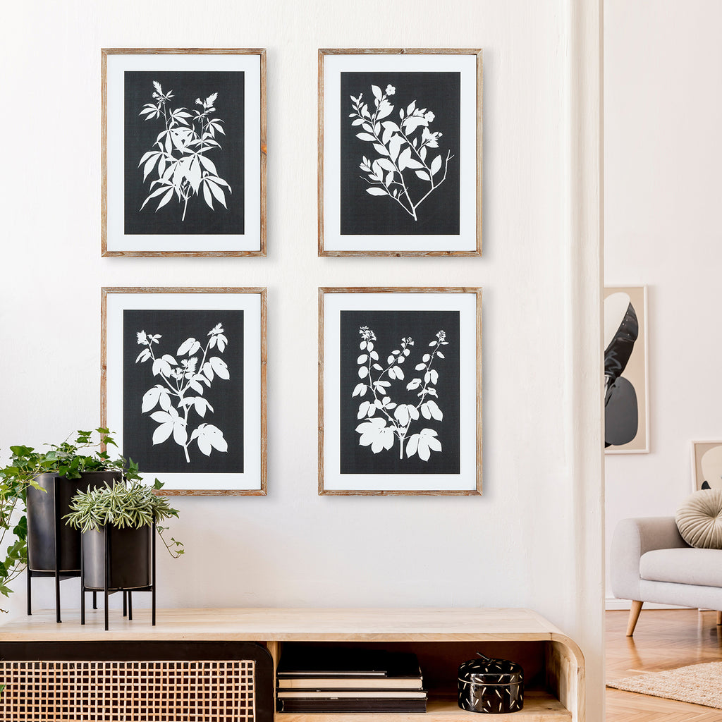 In a monochromatic composition, these botanical prints are a play on positive and negative space. Bold in scale, with a masculine aesthetic, this set of prints is finished off with real mats and coordinating grey washed frames. Perfect for office or study.