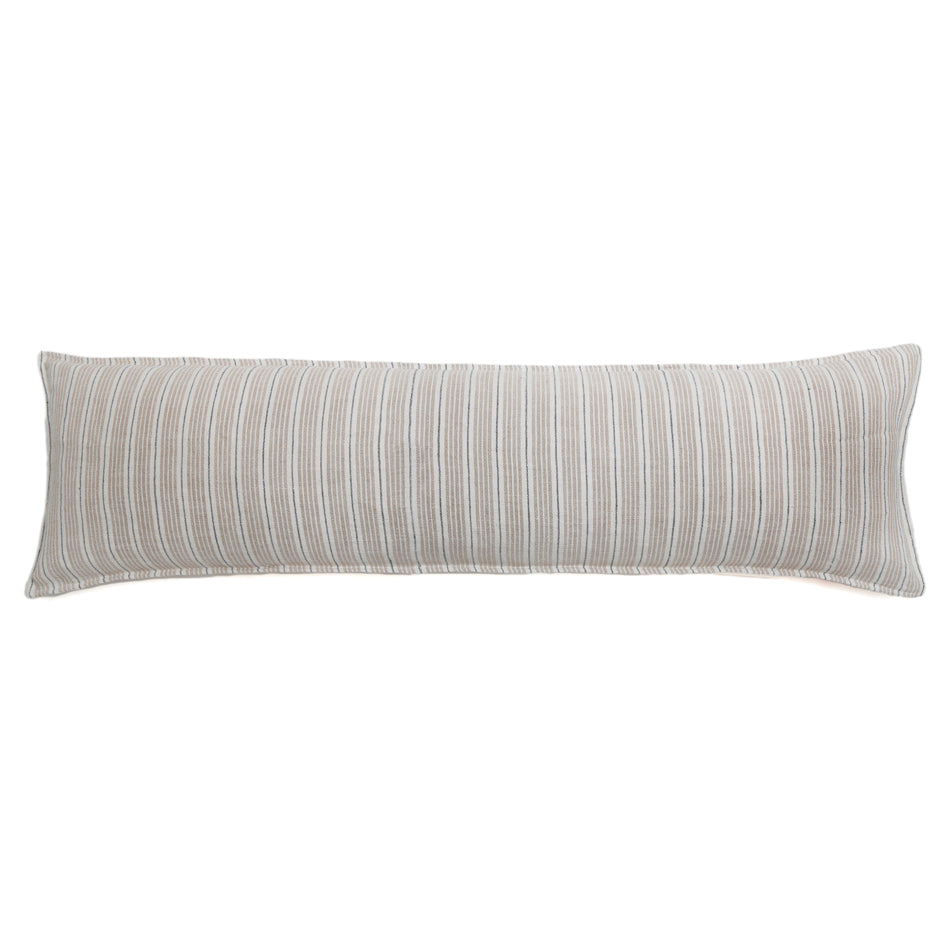 The soft, heavy knit linen is hand-loomed and features a thicker natural stripe alongside a thin midnight stripe.