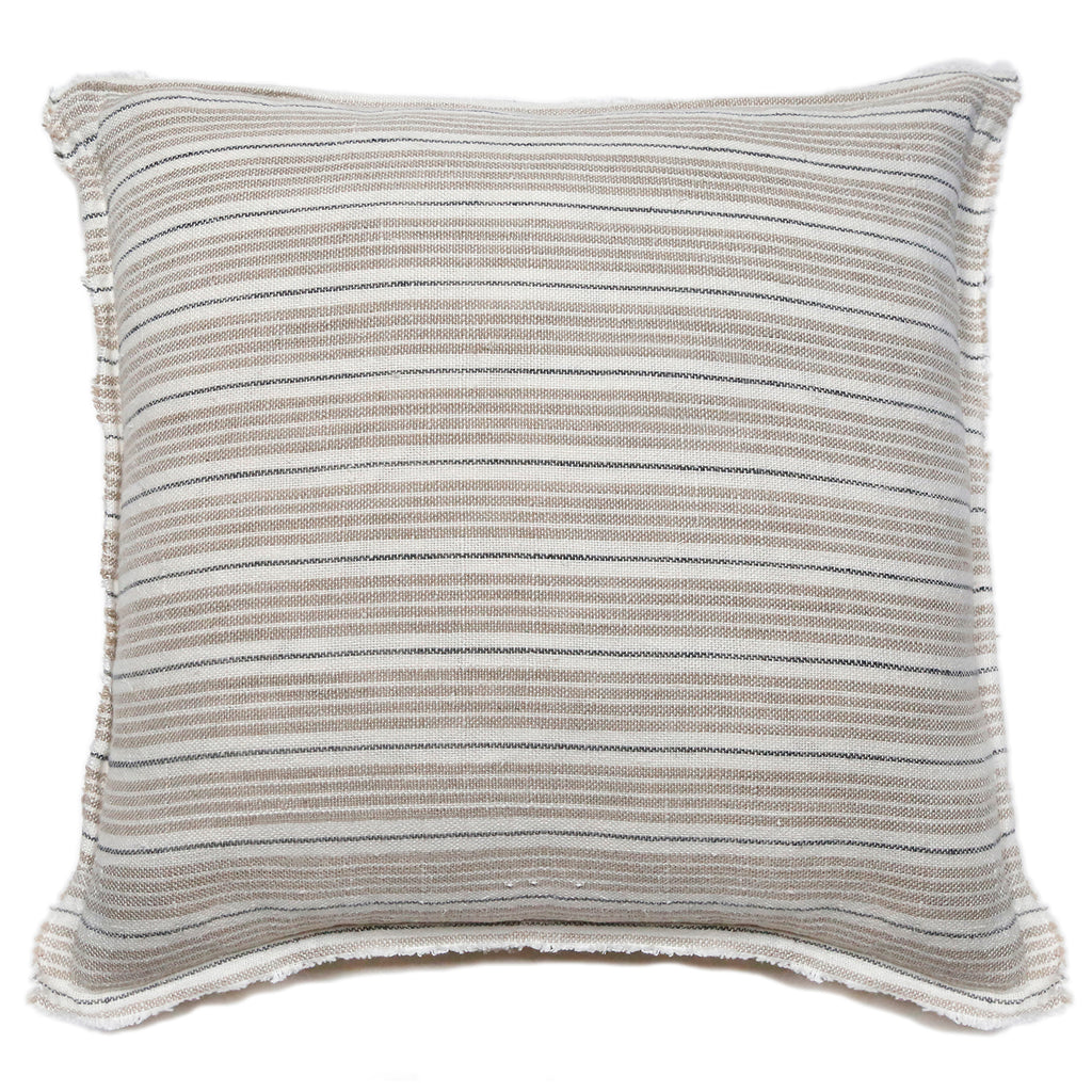This Pom Pom at Home 100% hand-loomed, heavy weight linen features a thicker natural stripe alongside a thin midnight stripe with a 1/2" frayed edge.