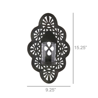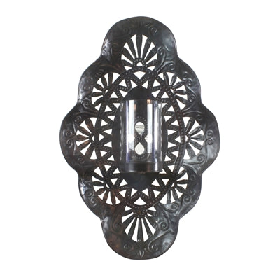 Mexicana details and Indian craftsmanship fuse together in the Sala Wall Sconce, fashioning a candlelight fixture that evokes the boldness and glamour of a bygone era. Burnt waxed metal creates a deep, dark finish. Removable glass hurricane included.