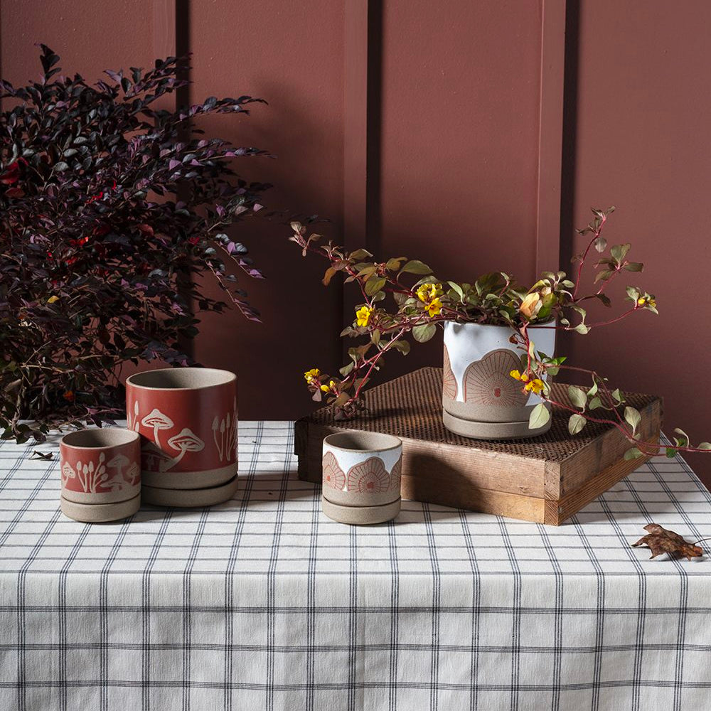 A relief of a woodland mushroom scene wraps around the Scavenger Pot, a sandstone pot complete with drainage hole and saucer. The mushroom scene is offset by a red toned glaze, and is perfect for a 3" or 4.5" drop in plant.