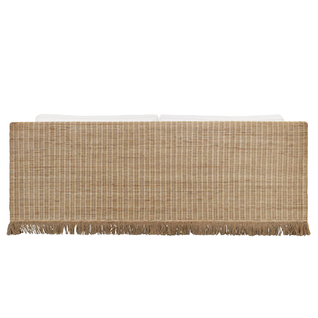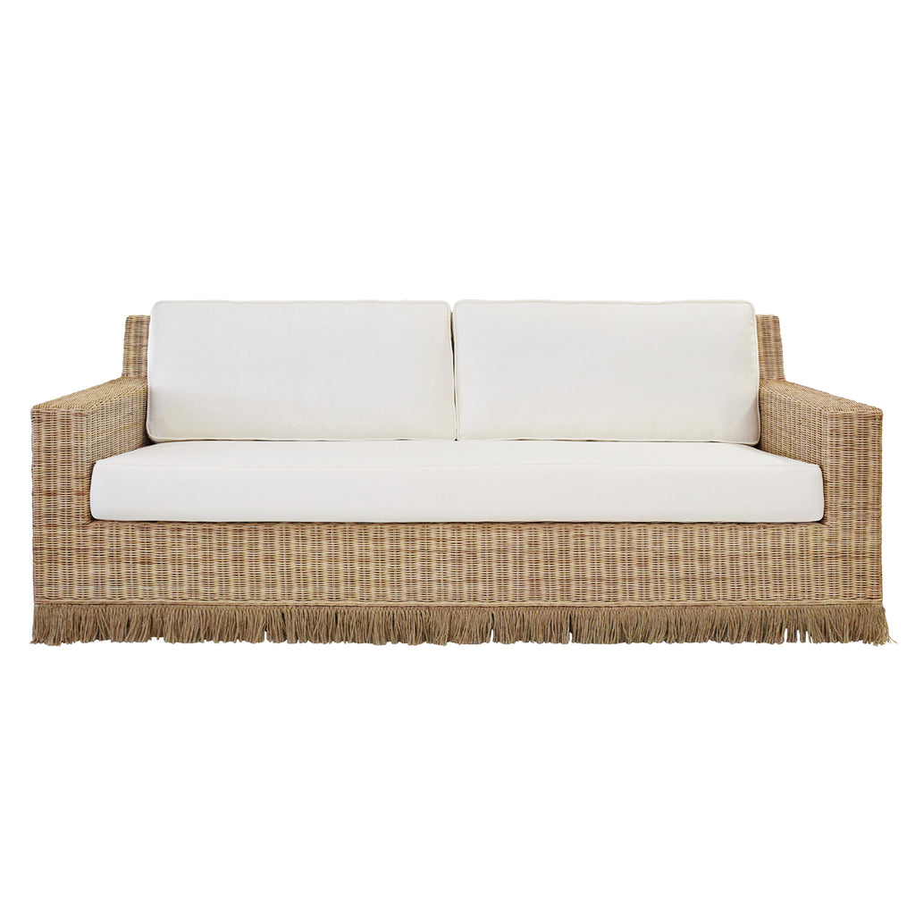 • Lawson style sofa in natural rattan with jute fringe skirt and ivory linen cushions