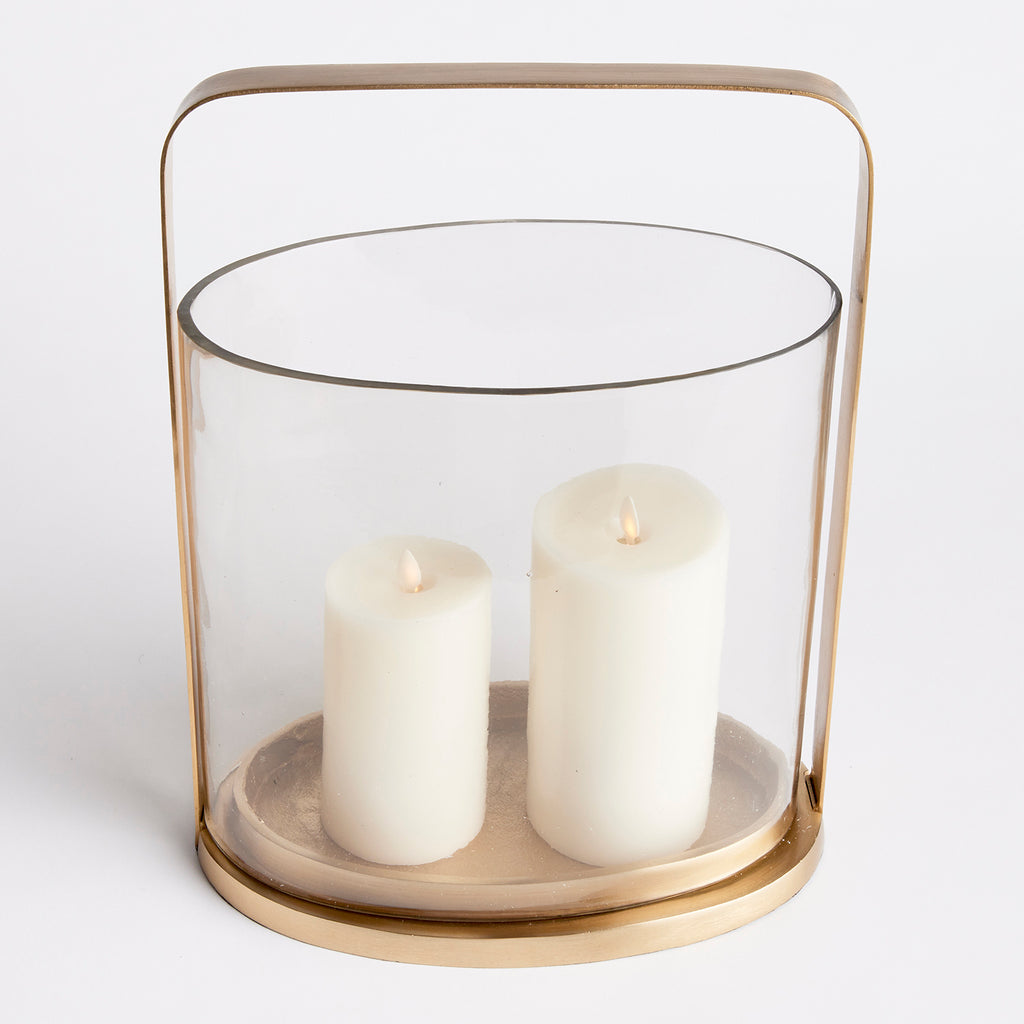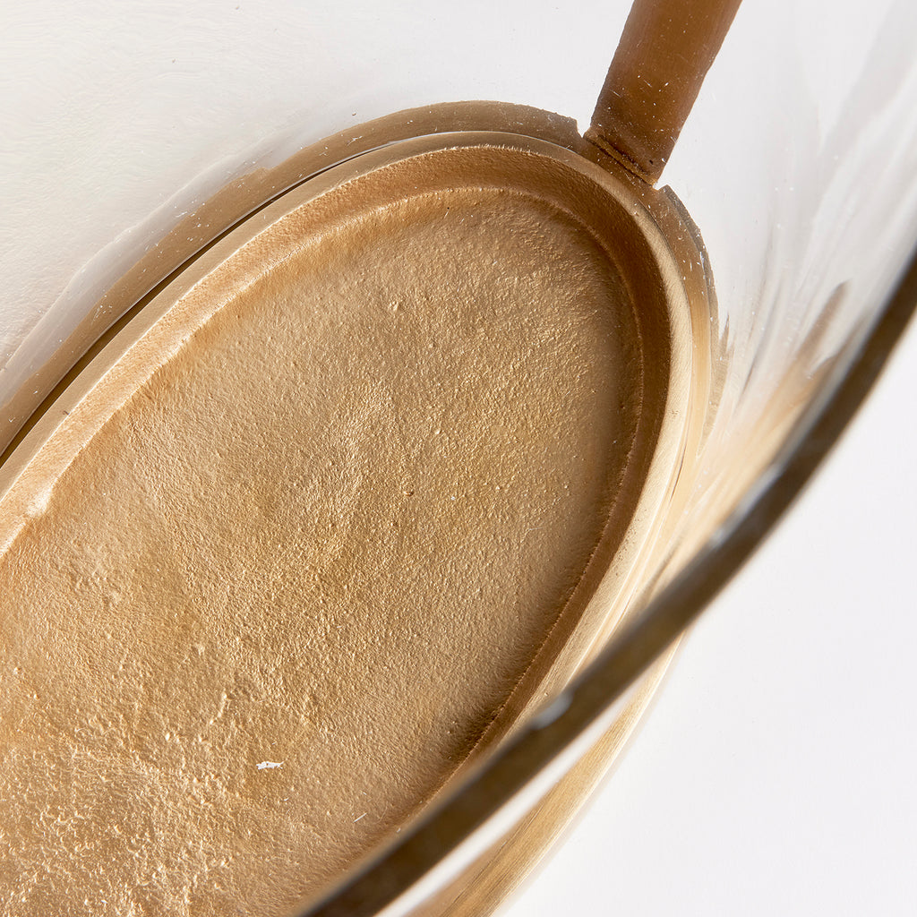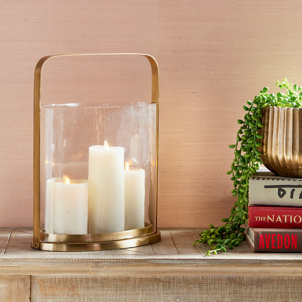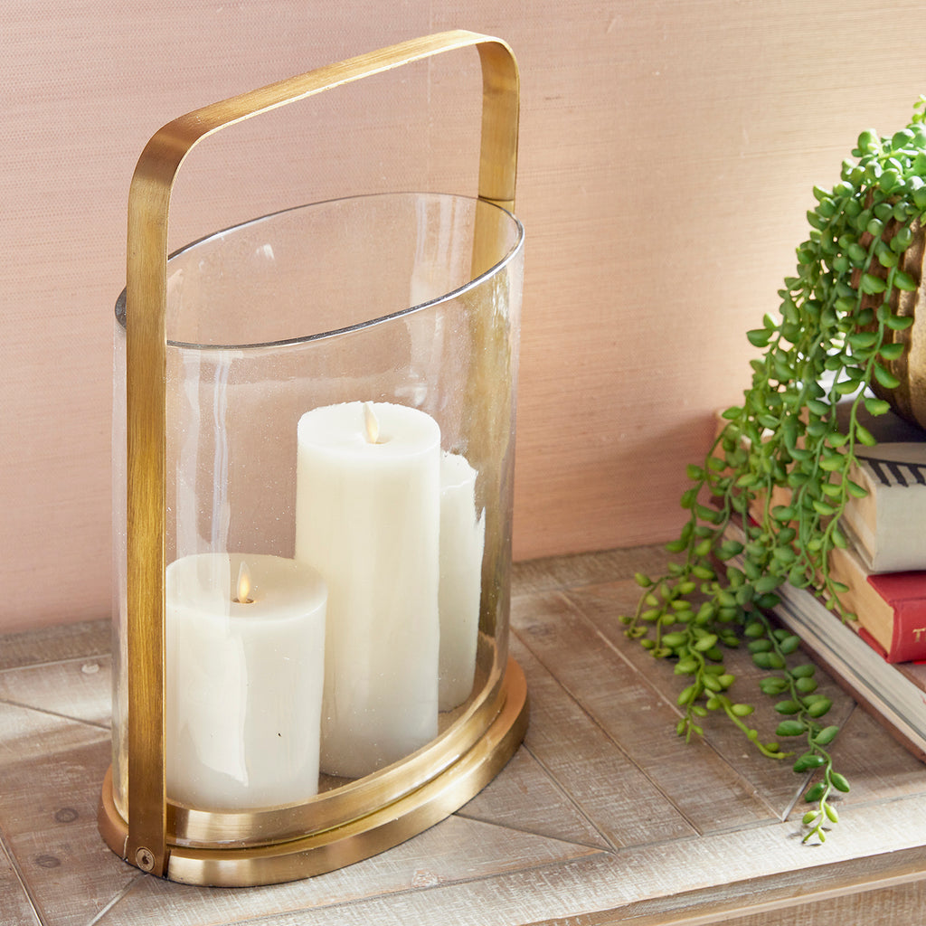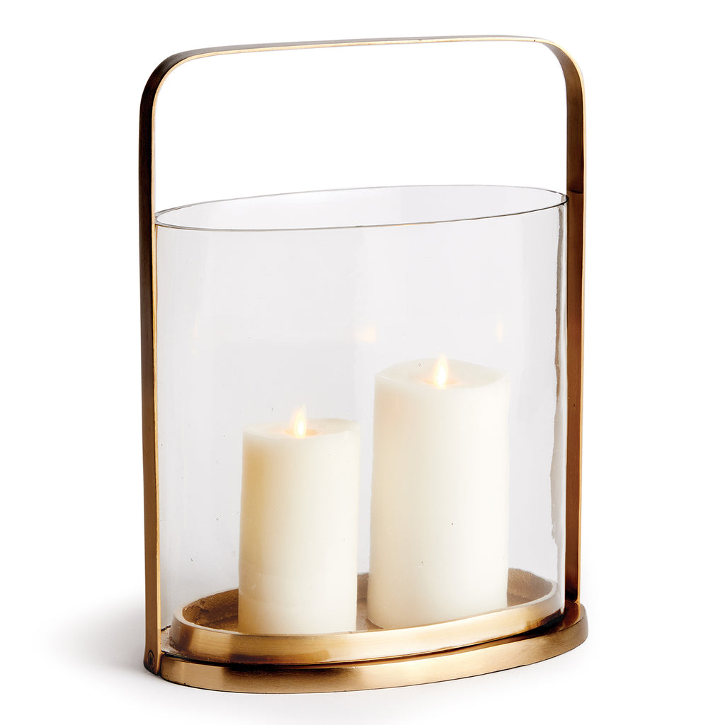 With a rare oval shaped glass hurricane, this unique candleholder is a work of art. The simple design and warm matte brass details only add to it's appeal.