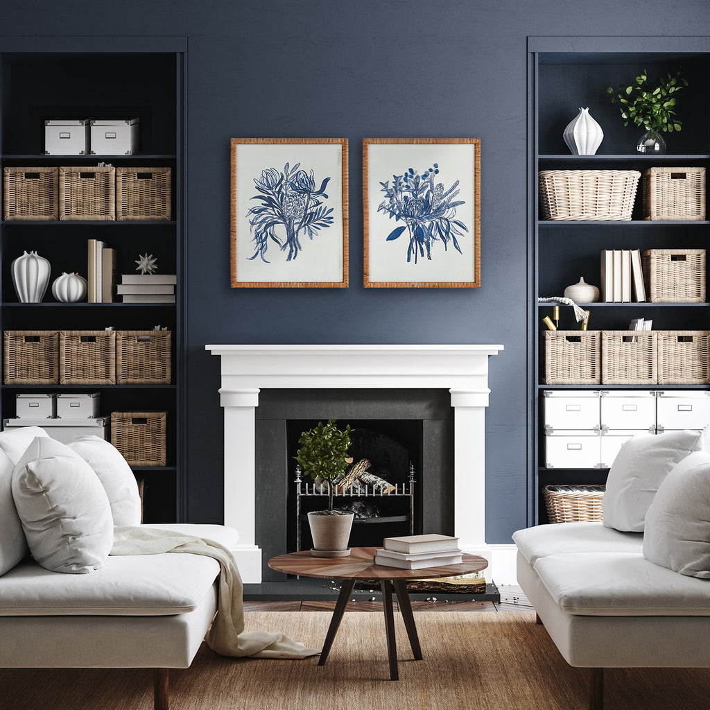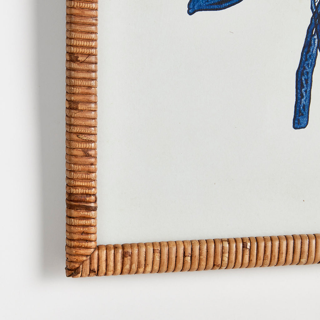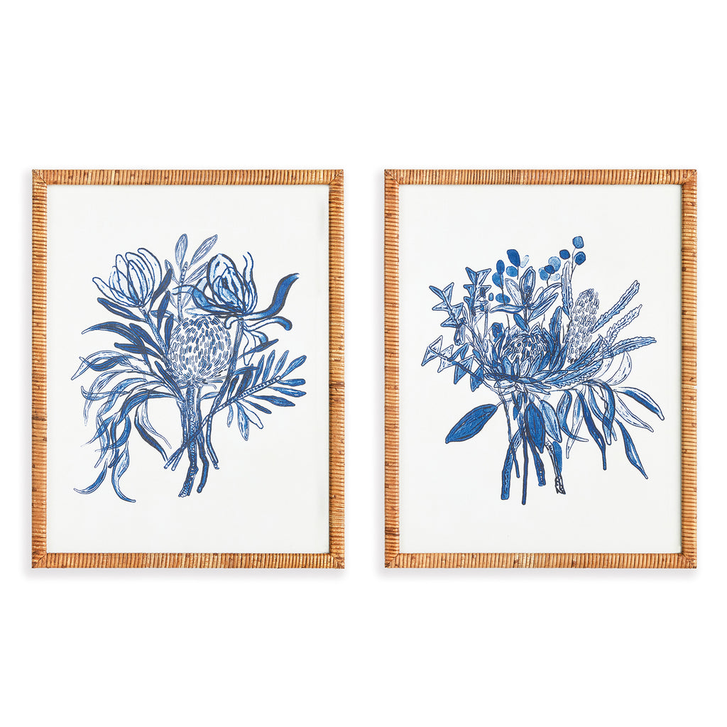 This monochromatic pair of whimsical floral bouquets are impressive in scale. Finished off with rattan wrapped frames, they are a lovely pair for bedroom, study or guest bath.