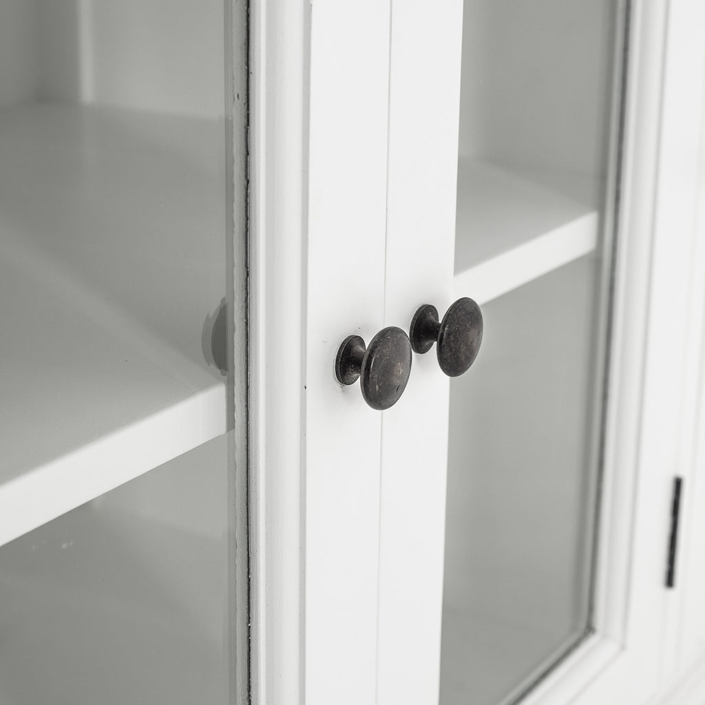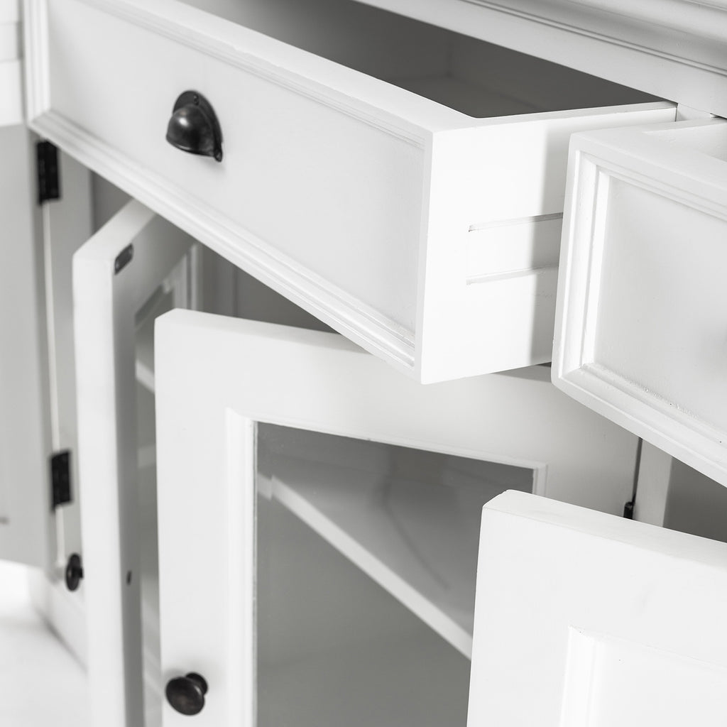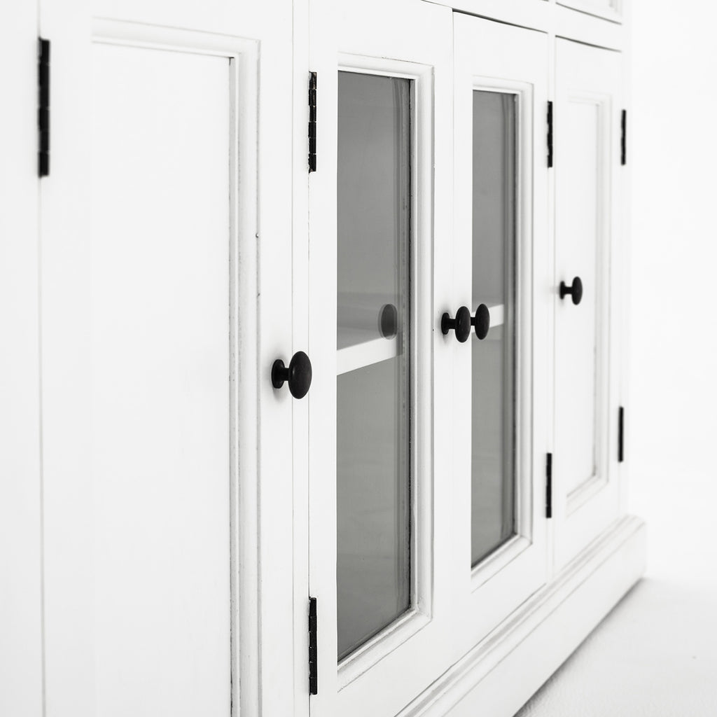 Beckton combines the quaint charm of the French Countryside with the coastal flair of the Eastern Seaboard to form a comprehensive range befitting the dining area, living space or bedroom. Detailed profiling on each piece, together with the warm finishing and antique brass hardware, provides a classic collection for the contemporary home. The generous proportions and farmhouse charm of this piece render it suitable for the kitchen and living space. Crown moulding and glass doors offer subtle styling. Utensils or linens can easily be housed in the drawers while fixed shelving behind the four doors provide ample storage.