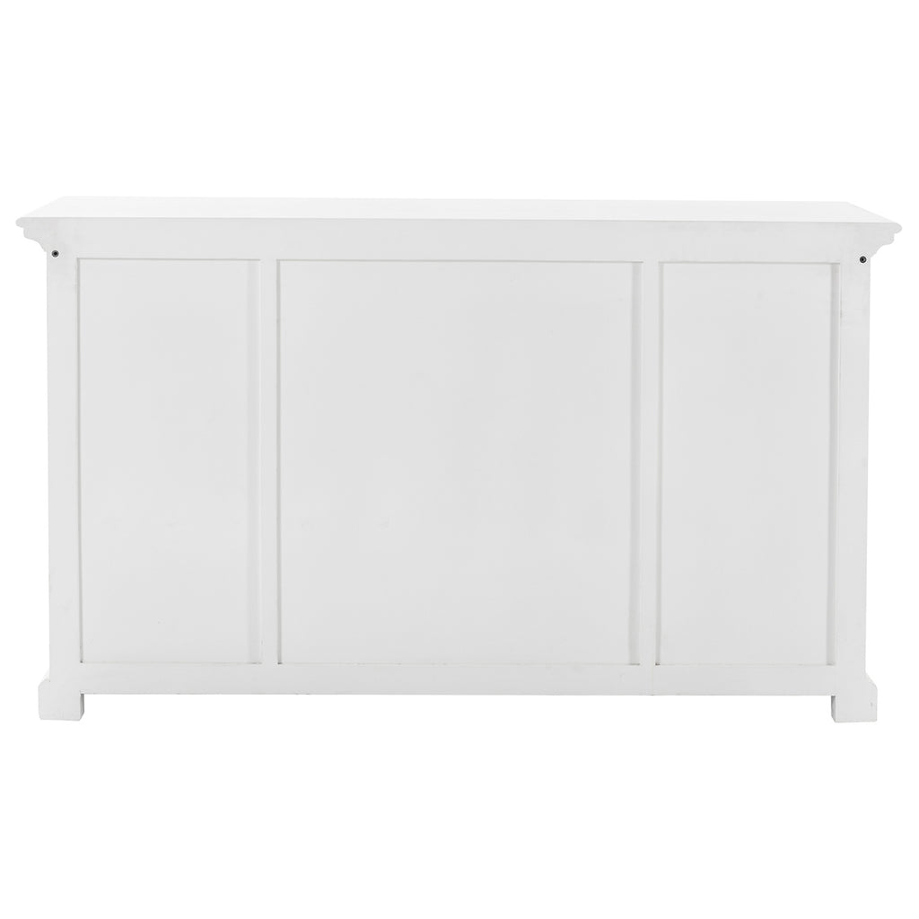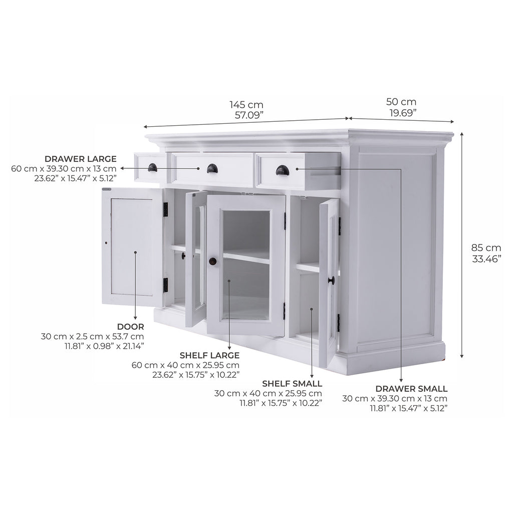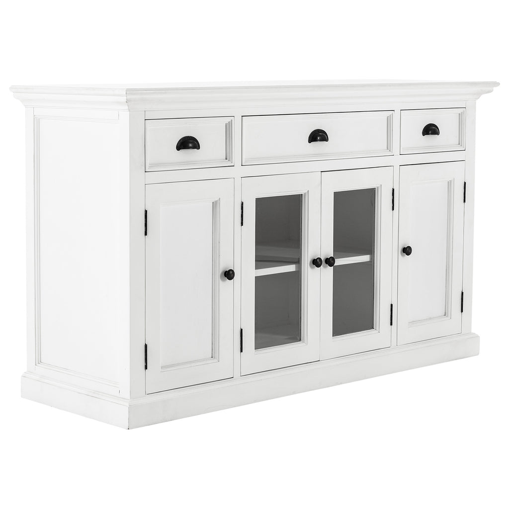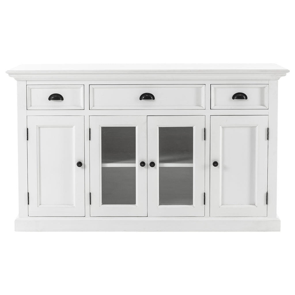 Beckton combines the quaint charm of the French Countryside with the coastal flair of the Eastern Seaboard to form a comprehensive range befitting the dining area, living space or bedroom. Detailed profiling on each piece, together with the warm finishing and antique brass hardware, provides a classic collection for the contemporary home. The generous proportions and farmhouse charm of this piece render it suitable for the kitchen and living space. Crown moulding and glass doors offer subtle styling. Utensils or linens can easily be housed in the drawers while fixed shelving behind the four doors provide ample storage.