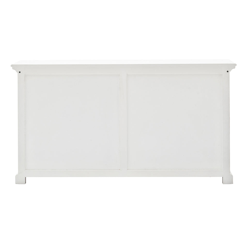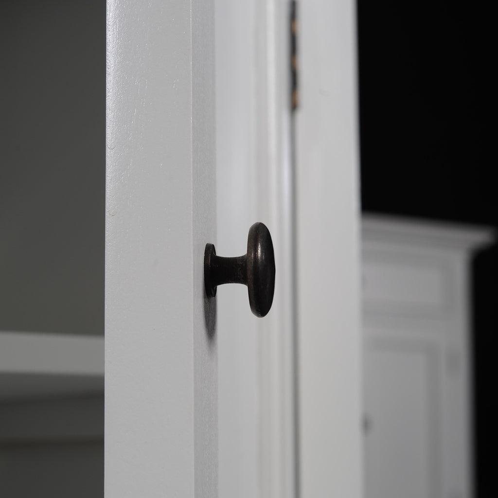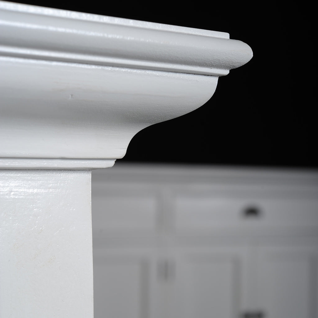 Beckton combines the quaint charm of the French Countryside with the coastal flair of the Eastern Seaboard to form a comprehensive range befitting the dining area, living space or bedroom. Detailed profiling on each piece, together with the warm finishing and antique brass hardware, provides a classic collection for the contemporary home. The generous proportions and farmhouse charm of this piece render it suitable for kitchen and living space. Crown moulding and shaker style doors offer subtle styling. Utensils or linens can easily be housed in the drawers while fixed shelving behind two sets of double doors provide ample storage.