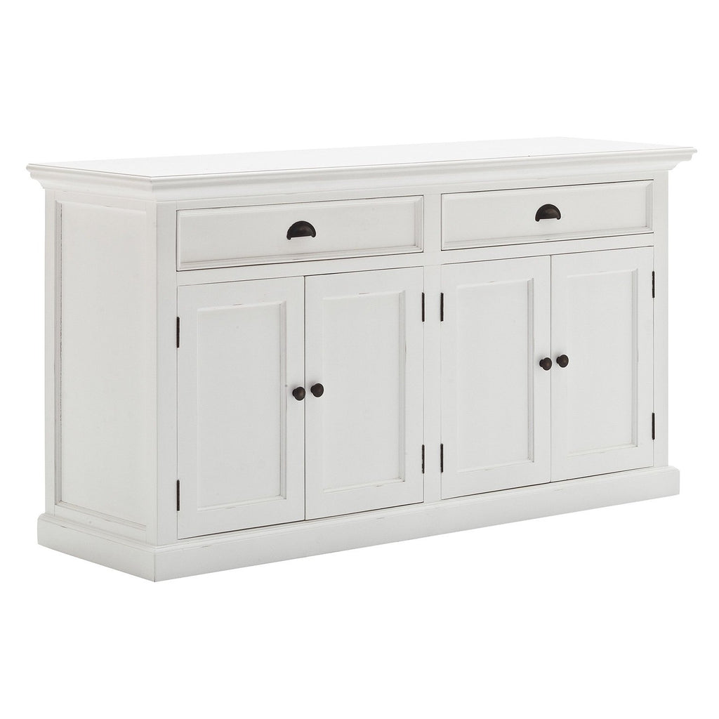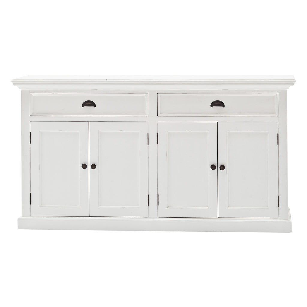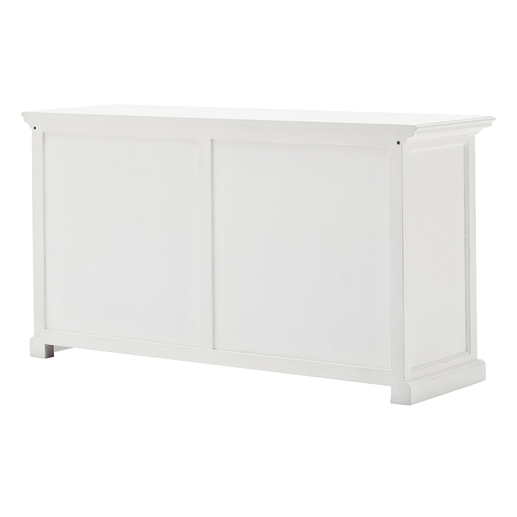 Beckton combines the quaint charm of the French Countryside with the coastal flair of the Eastern Seaboard to form a comprehensive range befitting the dining area, living space or bedroom. Detailed profiling on each piece, together with the warm finishing and antique brass hardware, provides a classic collection for the contemporary home. The generous proportions and farmhouse charm of this piece render it suitable for kitchen and living space. Crown moulding and shaker style doors offer subtle styling. Utensils or linens can easily be housed in the drawers while fixed shelving behind two sets of double doors provide ample storage.