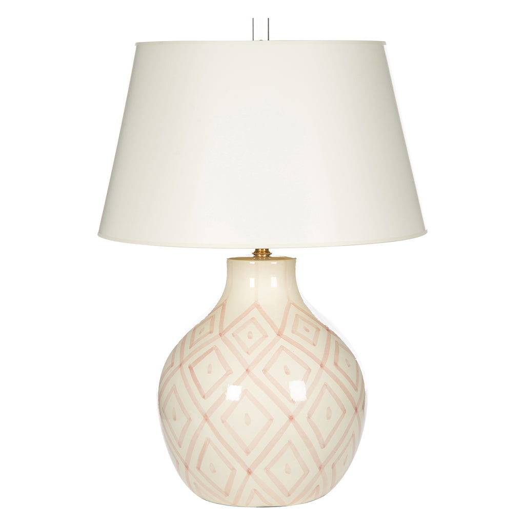 A hand-painted geometric bias design offers character and a touch of art to this ceramic table lamp. With a neutral pastel palette and charming country feel, it stylizes an easy, carefree living space. A soft off-white shade adds a perfect finishing touch.