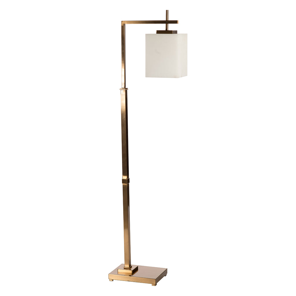 Angles and texture weave an impressive style in this sleek contemporary floor lamp. With a boxy alabaster shade suspended from a geometric brushed brass finish metal body, it creates order and consistency. This exceptional lamp is versatile and decorative, and an excellent choice to embellish a modern bedroom or living room.