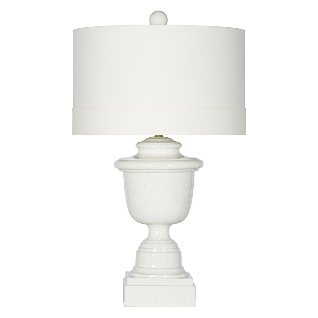 Bring dimension and depth to your stylish decor with this impressive ceramic trophy table lamp. It features an over-scaled body resting on a stepped base and topped with a large ball finial, all in a monochromatic creamy white finish. A drum shade features a wide band accent that pulls the entire design together to perfection.
