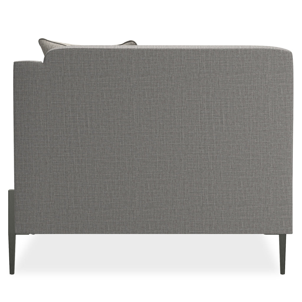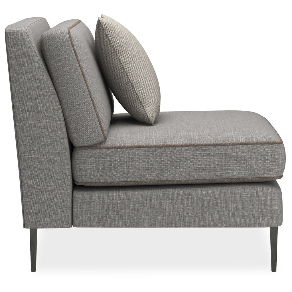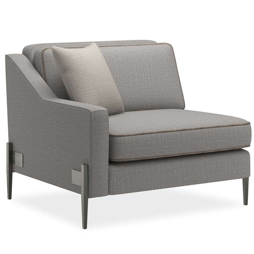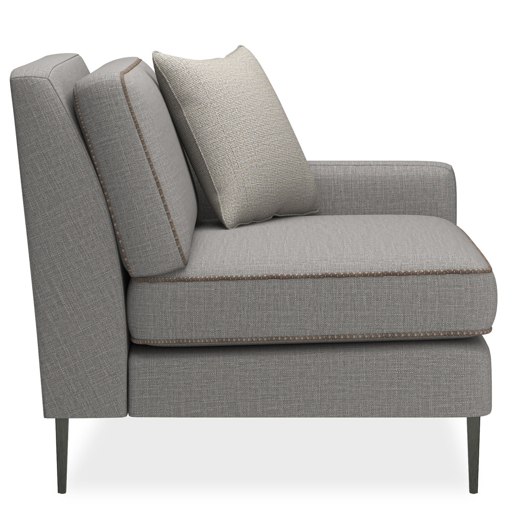 If an updated sectional is what you need for seating flexibility, we have a stylish piece that uses a mix of textural materials for classic appeal. Pieces that affords a clean silhouette updated with a suspended frame, slim tapered metal legs, decorative leg brackets and loose seat and back Blendown cushions. This silhouette is upholstered to perfection in a grey wool blend woven with a contrasting tan leather welt.