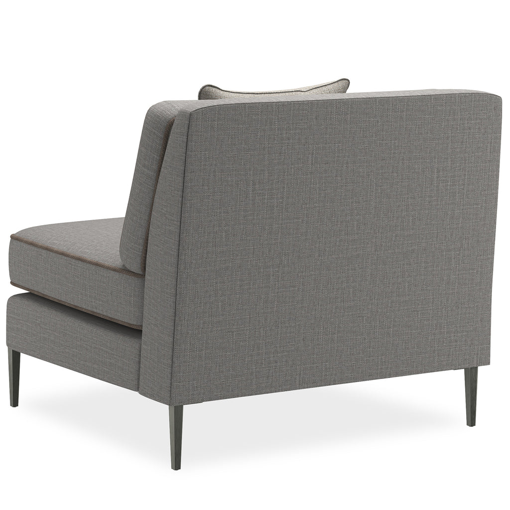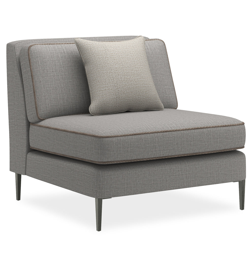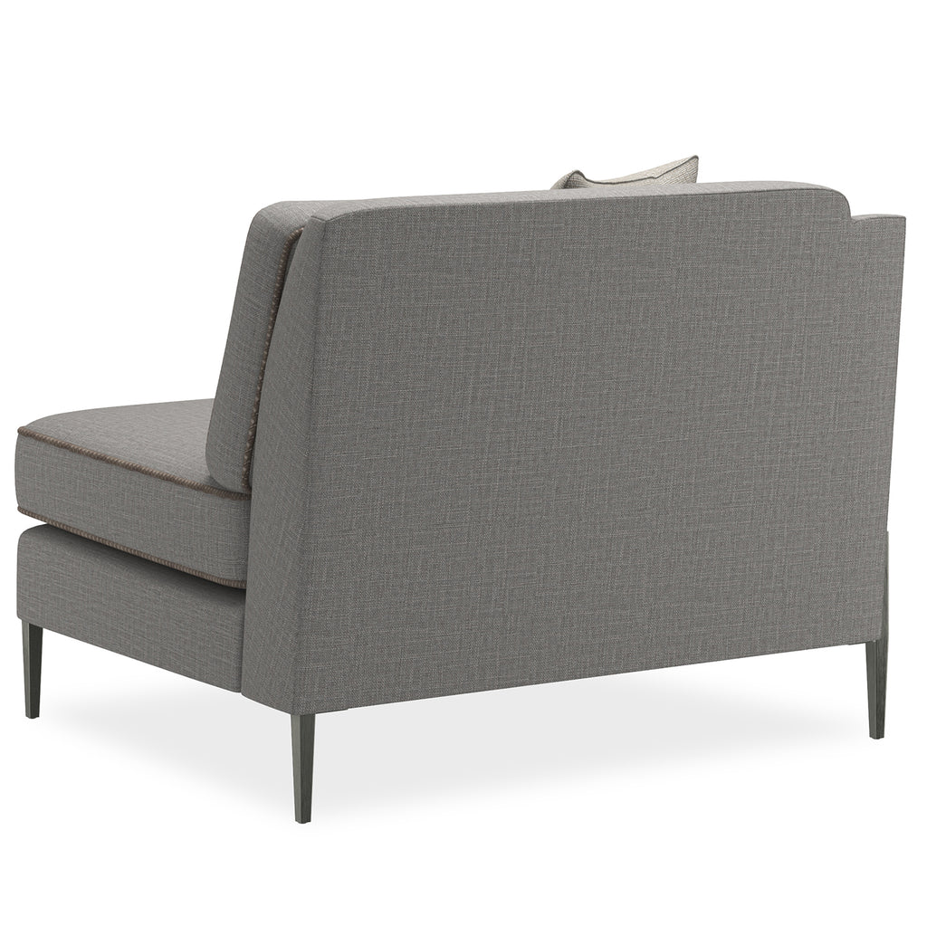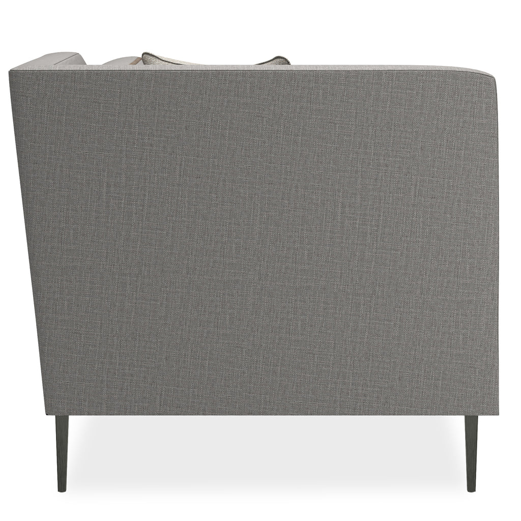 If an updated sectional is what you need for seating flexibility, we have a stylish piece that uses a mix of textural materials for classic appeal. Pieces that affords a clean silhouette updated with a suspended frame, slim tapered metal legs, decorative leg brackets and loose seat and back Blendown cushions. This silhouette is upholstered to perfection in a grey wool blend woven with a contrasting tan leather welt.